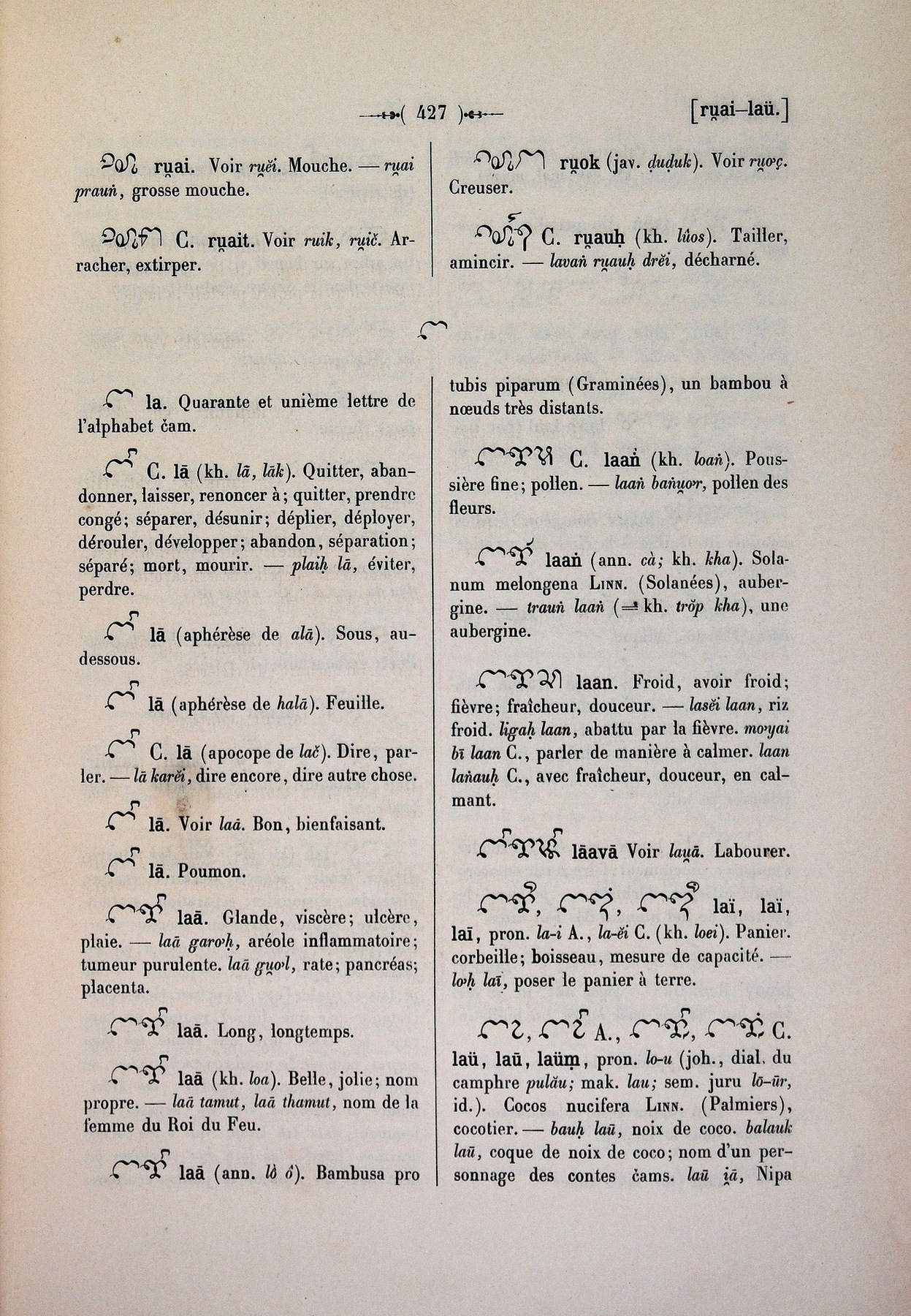 Quote this document Cabaton, Antoine; Aymonier, Etienne 1906 [accessed: 2026/2/5]. "la" (Object Id: 11132). In Dictionnaire Cam-Français, E. Aymonier et A. Cabaton. ODSAS: https://www.odsas.net/object/11132.
