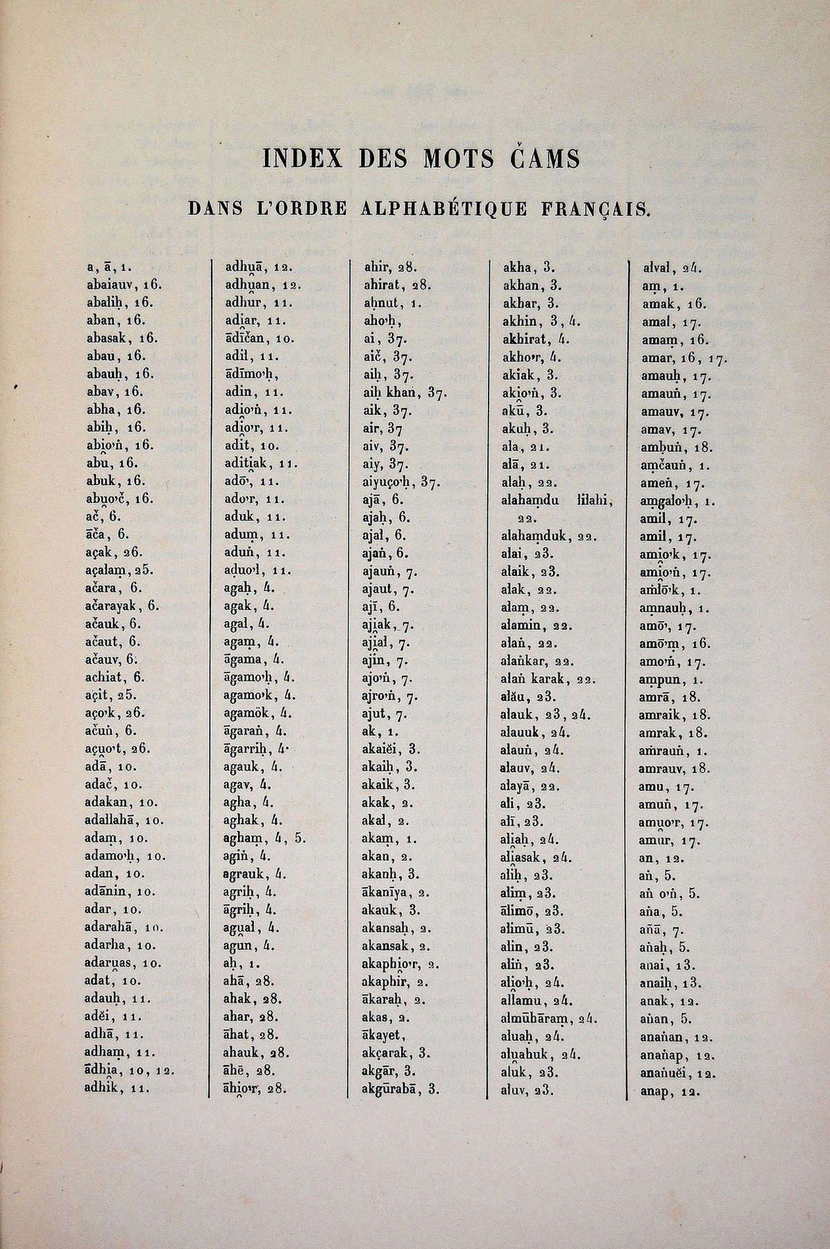 Dictionnaire Cam-Français, E. Aymonier et A. Cabaton / index des mots cam dans l'ordre alphabétique français / Cabaton, Antoine; Aymonier, Etienne /  Viet Nam/ Viet Nam