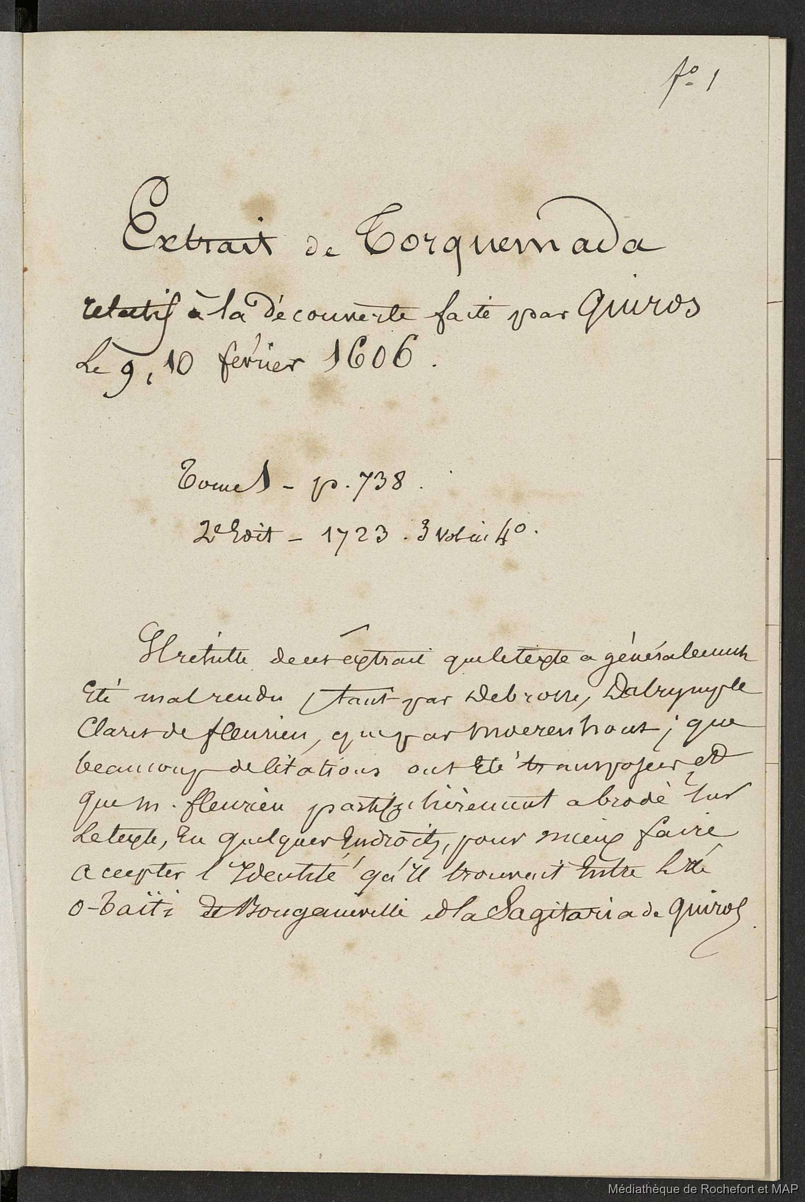 Lesson, Pierre-Adolphe 1723 [accessed: 2026/2/5]. "Extrait de Torquemada, relatif à la découverte faite par Quiros les 9,10 février 1606 (B172996201_BM08155)" (Object Id: 156519). In