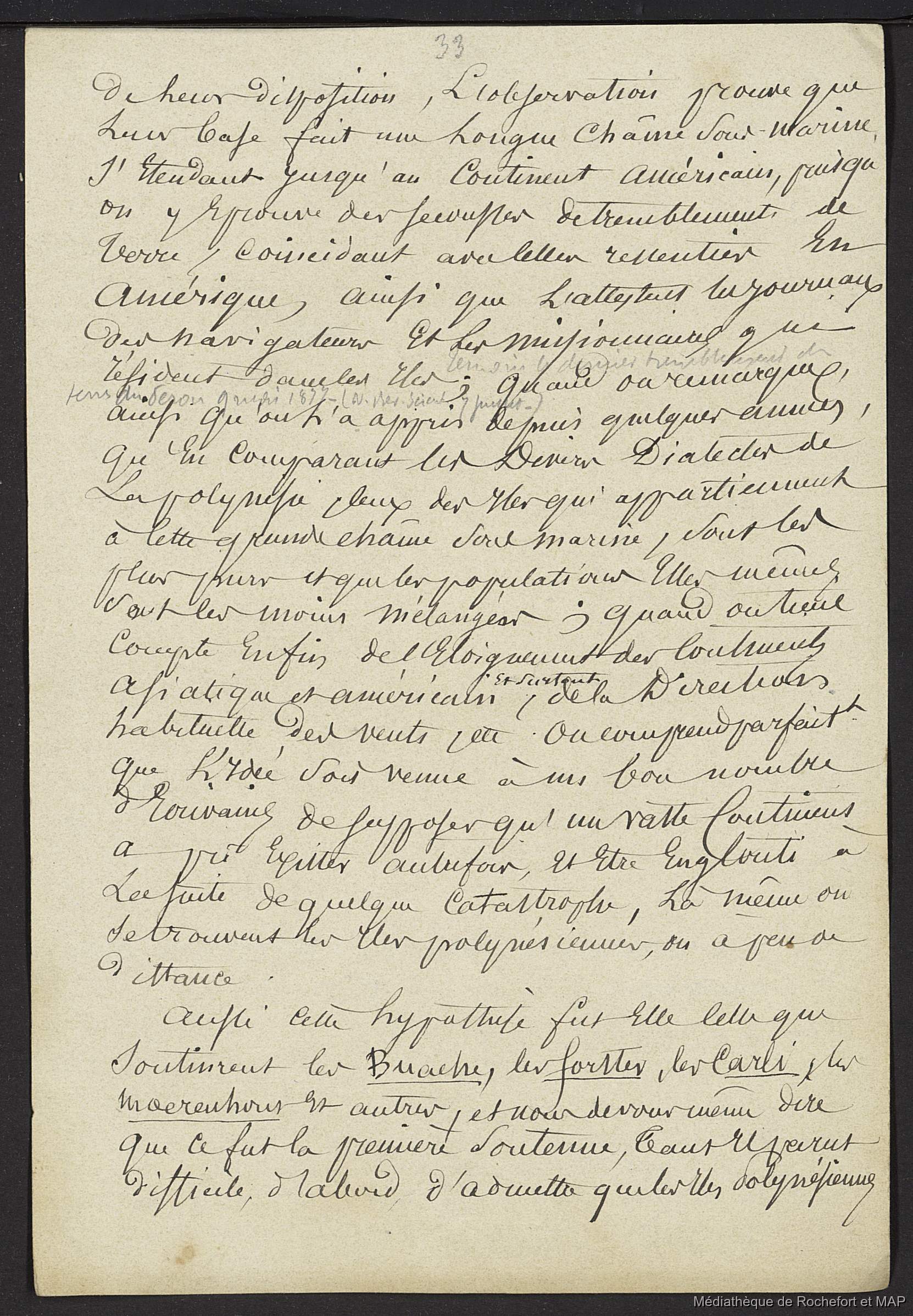 Lesson, Pierre-Adolphe [accessed: 2025/12/8]. "Théorie des migrations. 1ère théorie : provenance d'un continent en partie submergé (B172996201_Ms00169)" (Object Id: 164507). In