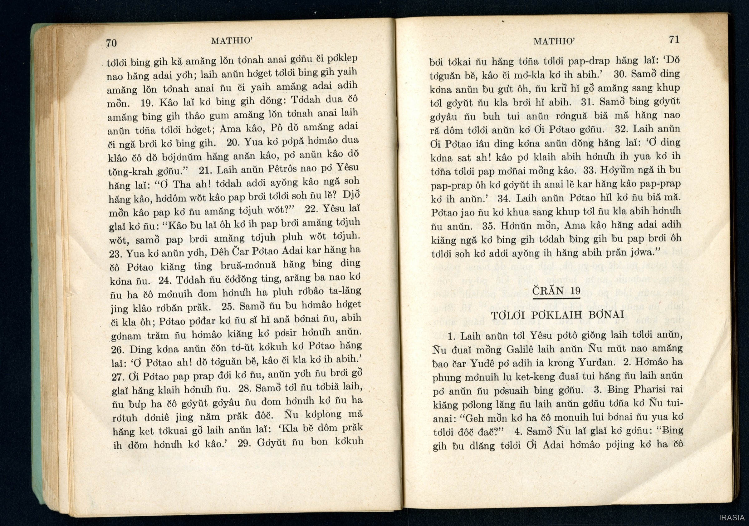 Quote this document Dournes, Jacques 1946-1955 [accessed: 2026/2/5]. "Evangiles : Tơlơi phrâo hiăm MATHIƠ" (Object Id: 174647). In Evangiles : Tơlơi phrâo hiăm MATHIƠ. ODSAS: https://www.odsas.net/object/174647.