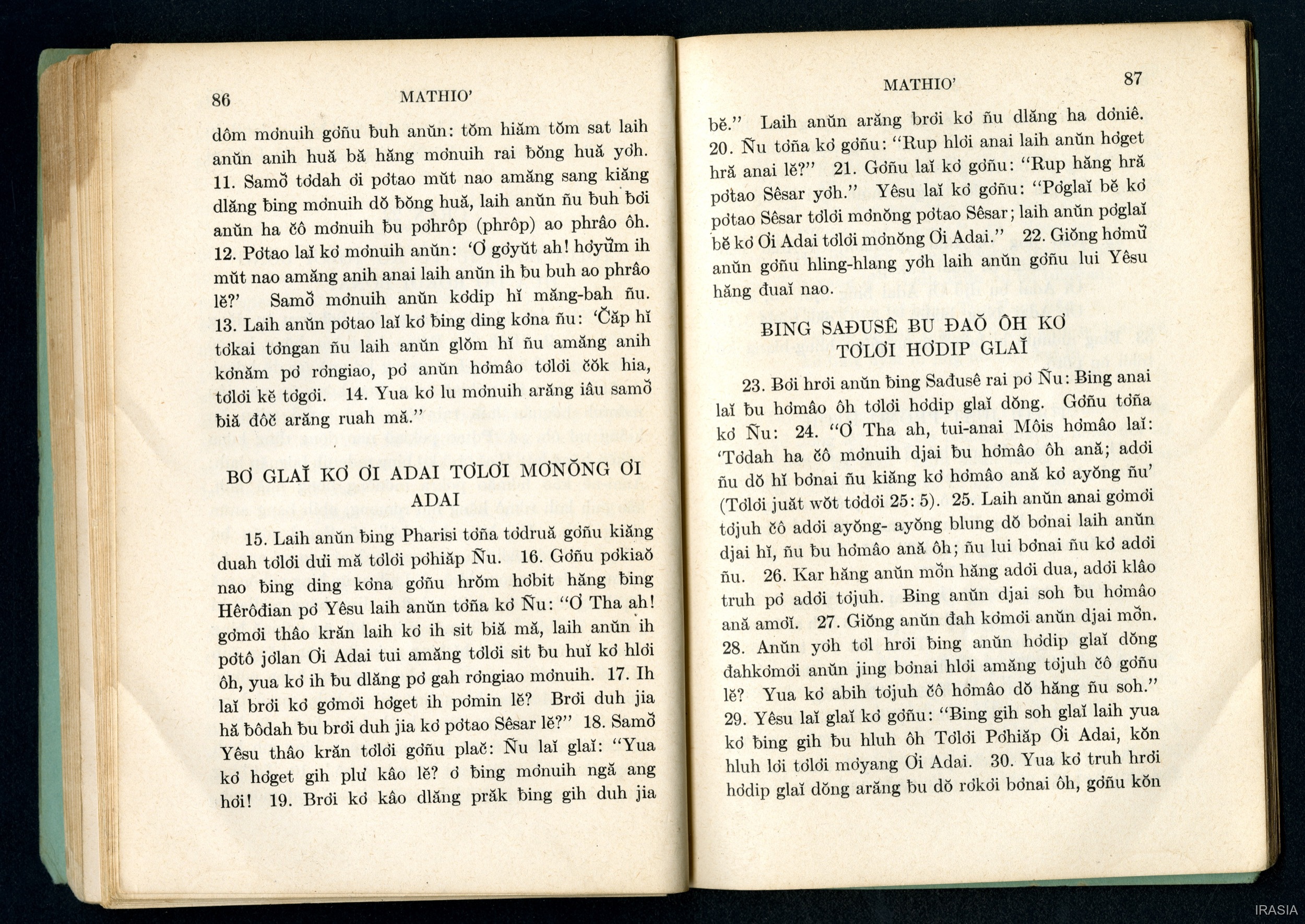 Quote this document Dournes, Jacques 1946-1955 [accessed: 2026/2/5]. "Evangiles : Tơlơi phrâo hiăm MATHIƠ" (Object Id: 174655). In Evangiles : Tơlơi phrâo hiăm MATHIƠ. ODSAS: https://www.odsas.net/object/174655.