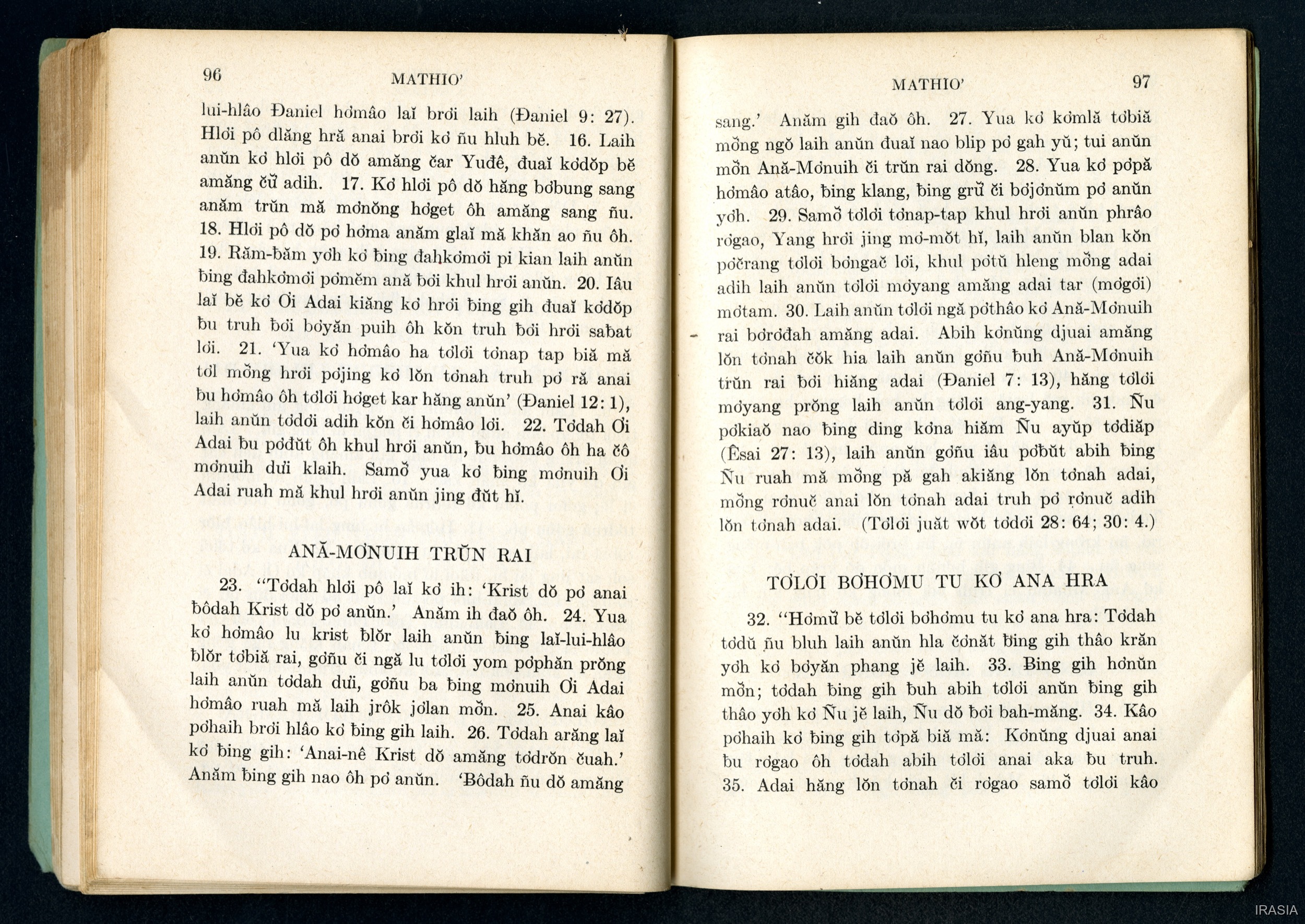 Quote this document Dournes, Jacques 1946-1955 [accessed: 2026/2/5]. "Evangiles : Tơlơi phrâo hiăm MATHIƠ" (Object Id: 174660). In Evangiles : Tơlơi phrâo hiăm MATHIƠ. ODSAS: https://www.odsas.net/object/174660.