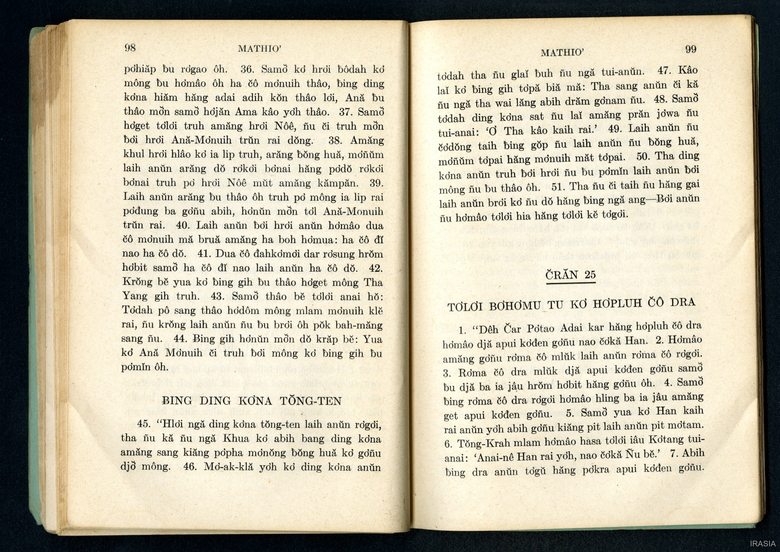 Quote this document Dournes, Jacques 1946-1955 [accessed: 2026/2/5]. "Evangiles : Tơlơi phrâo hiăm MATHIƠ" (Object Id: 174661). In Evangiles : Tơlơi phrâo hiăm MATHIƠ. ODSAS: https://www.odsas.net/object/174661.