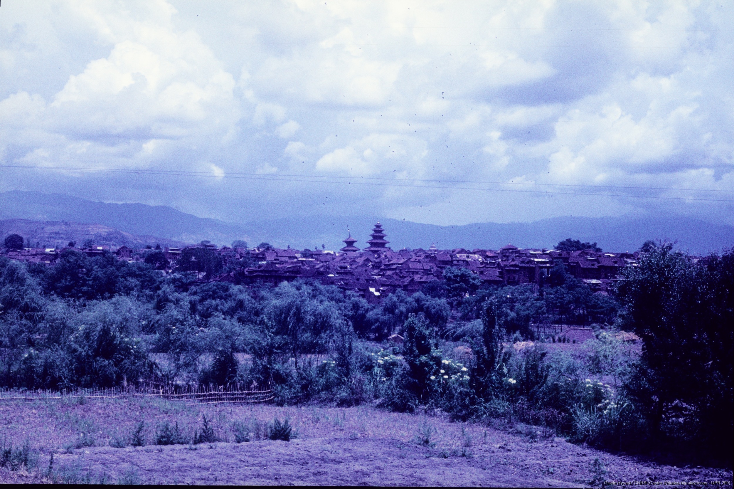 Vallée de Kathmandu c.1970 / Vue de Bhaktapur (depuis la route allant à Banepa) avec les temples du Nyatapola et de Kashi Vishwanath.  / Hyvert, Gisèle  / Bhaktapur (Bhaktapur district), Népal