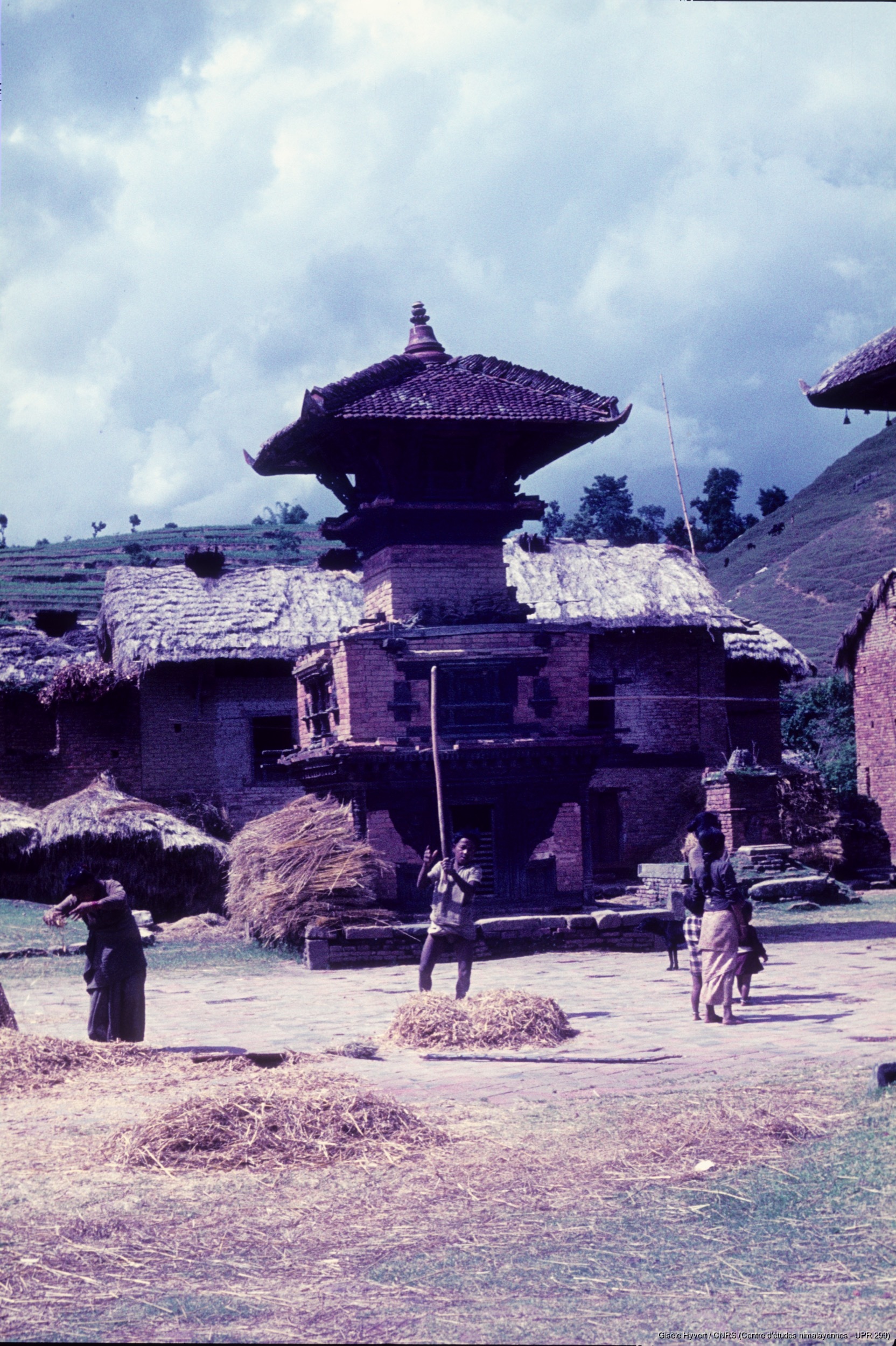Hyvert, Gisèle 1970 (circa) [accessed: 2026/2/5]. "Battage dans l'enceinte du temple d'Indreshwar Mahadev avec à l'arrière-plan le temple de Visheshwar (Bisheshwor) Mahadev en ruine. " (Object Id: 188737). In