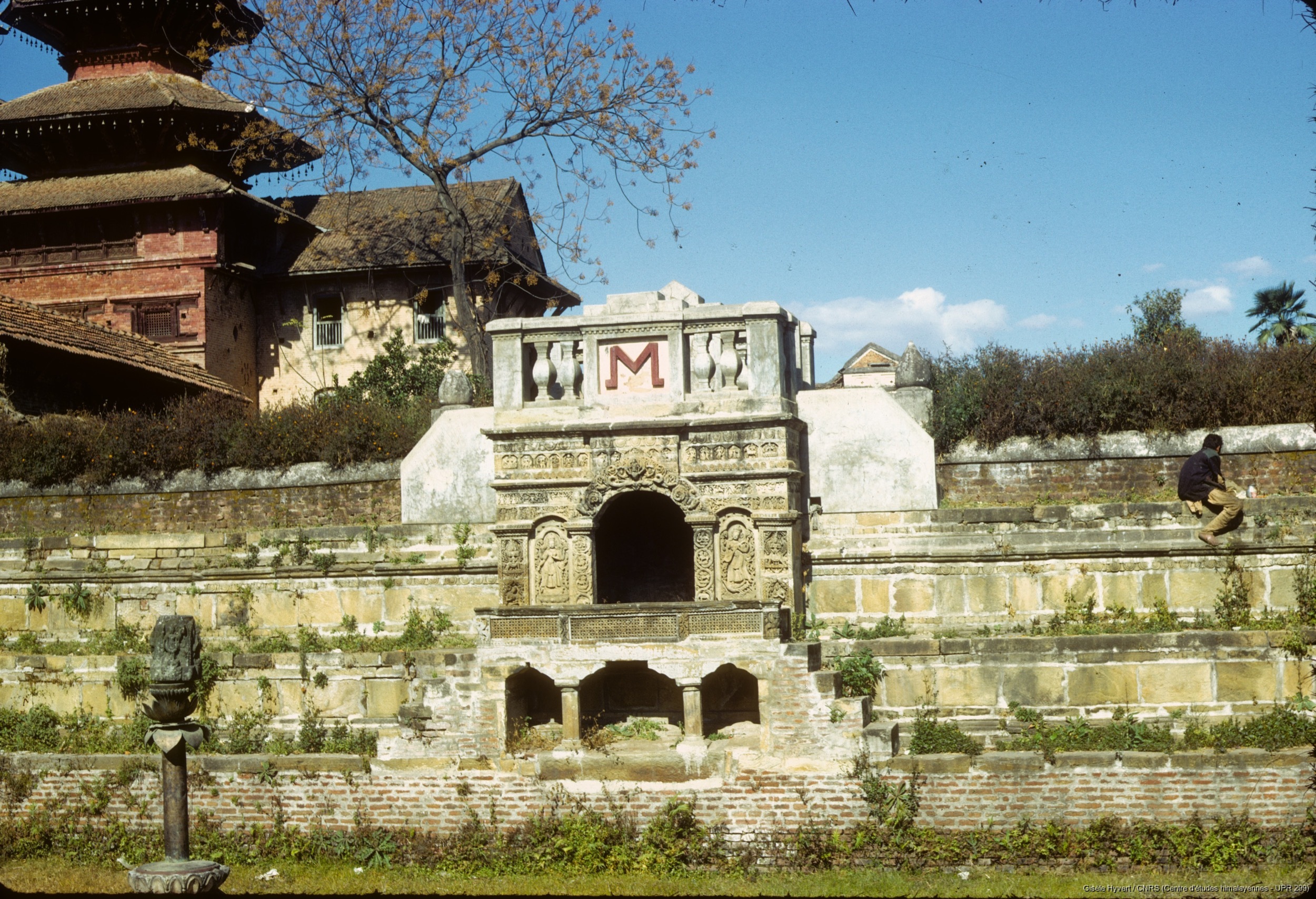 Vallée de Kathmandu c.1971 / Jardin du palais royal, face sud du pavillon du bassin Bhandarkhal. A l'arrière, le temple de Taleju à l'intérieur du palais royal.  / Hyvert, Gisèle  / Patan (Lalitpur district), Népal