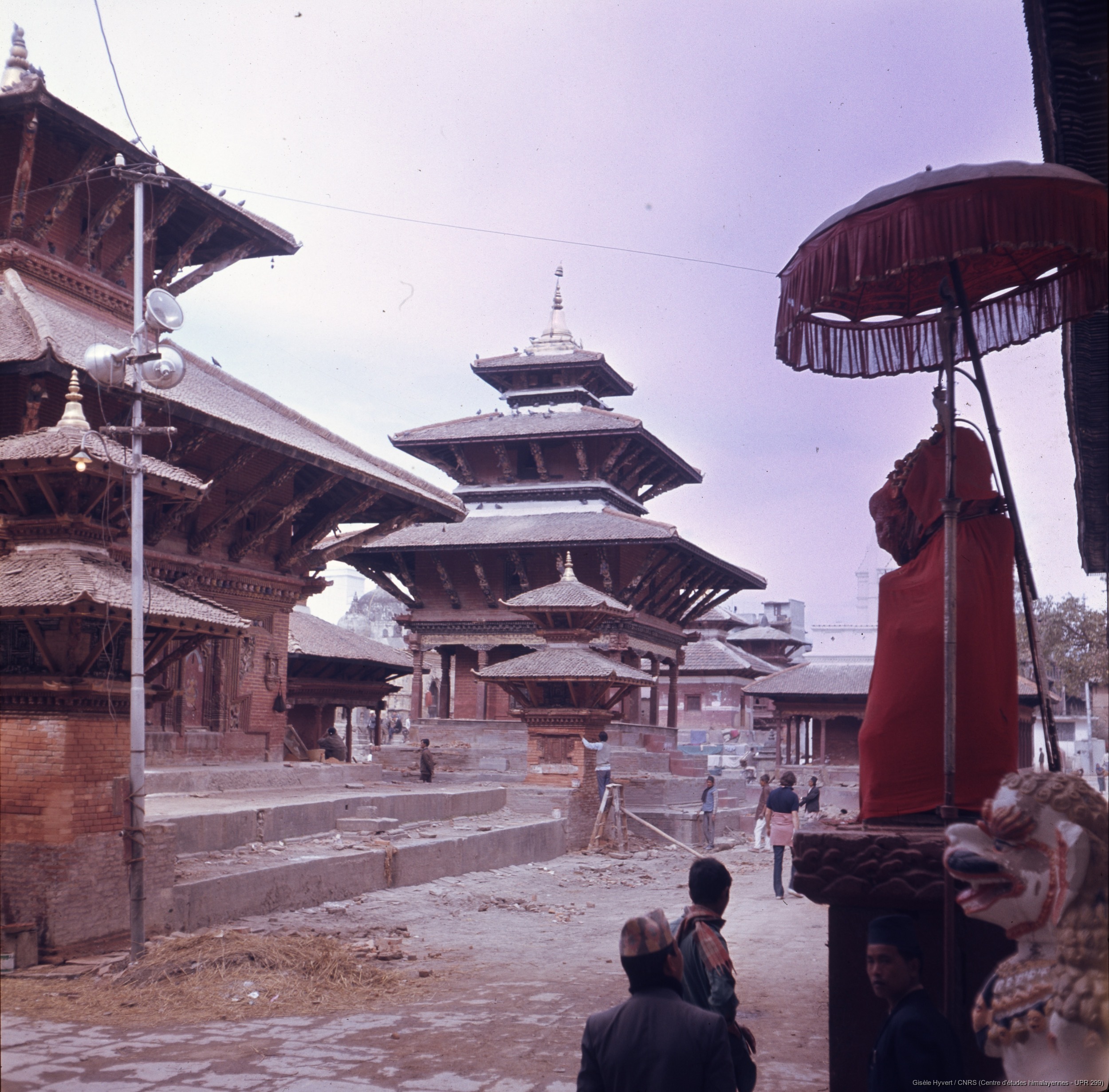 Vallée de Kathmandu c.1972-1975 / Vue sur les temples de Jagannath et de Narayan depuis l'entrée de Hanuman Dhoka.  / Hyvert, Gisèle  / Kathmandu, Durbar square (Kathmandu district), Népal