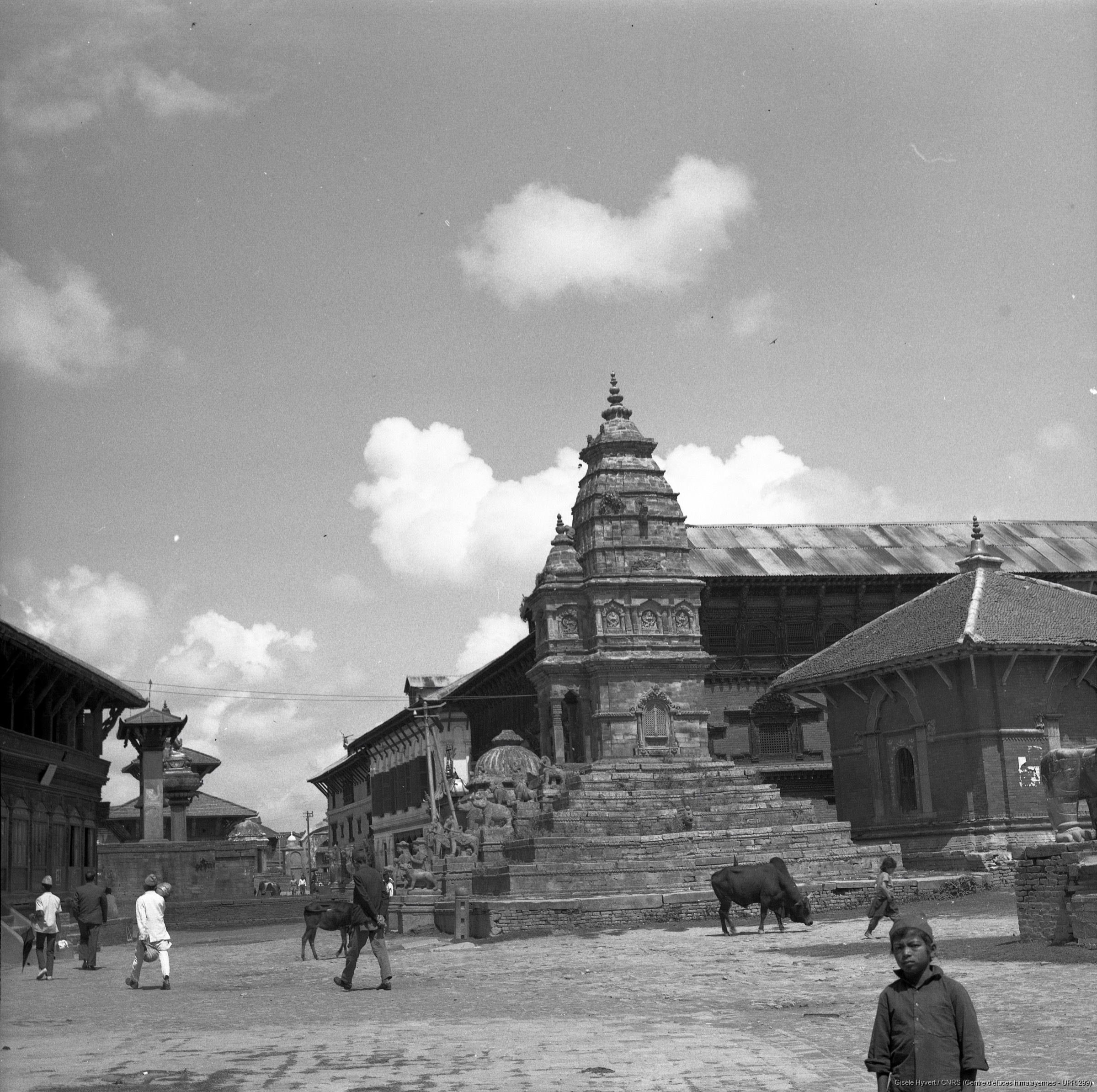 Hyvert, Gisèle 1970-1975 (circa) [accessed: 2026/2/5]. "Temples de Siddhi Lakshmi (Bhagawati) et de Vatsala devi (à droite). Au fond, le palais royal de Bhaktapur donnant sur le Durbar square. " (Object Id: 189287). In
