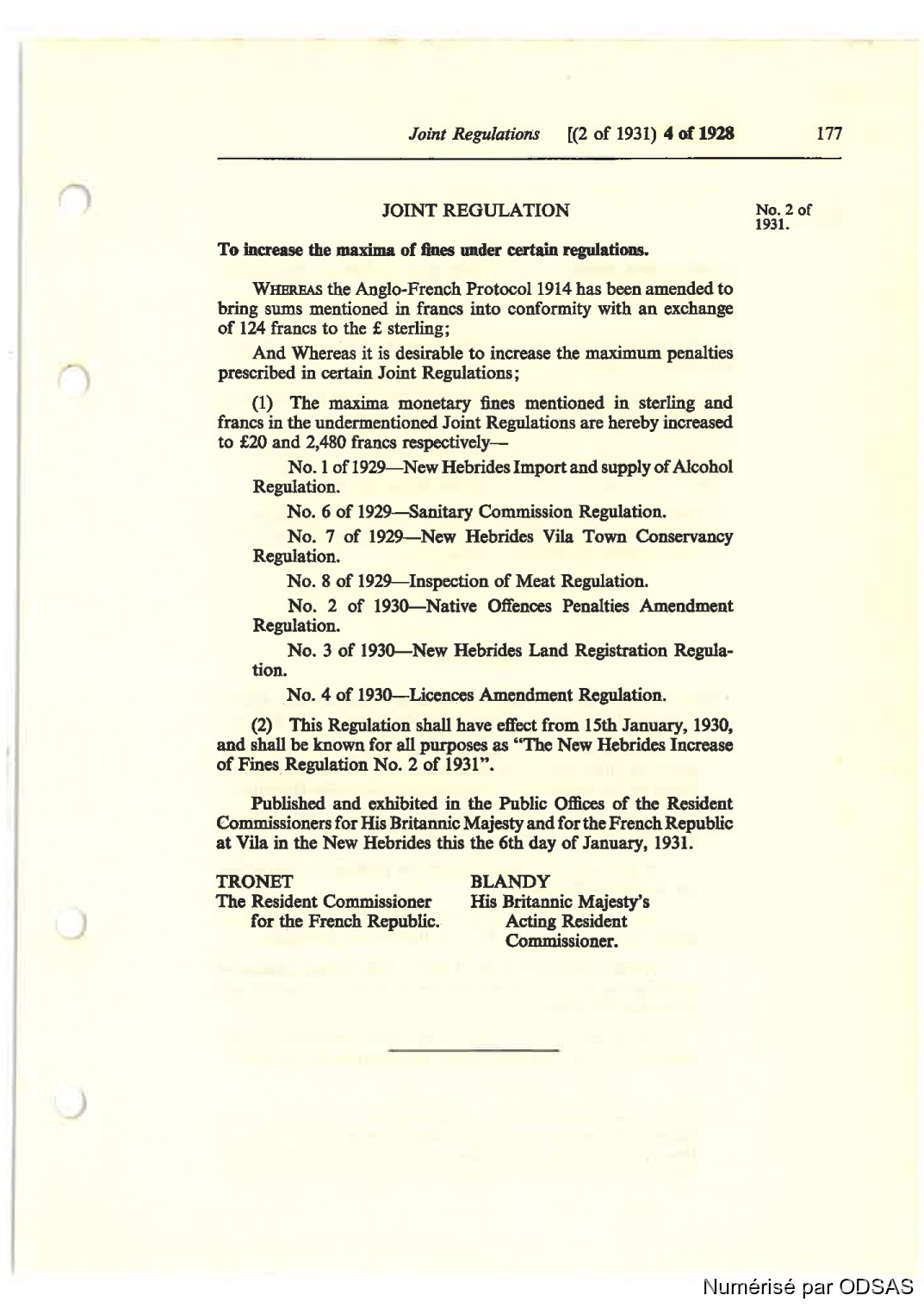 No. 1 of 1929—New Hebrides Impon and supply of Alcohol