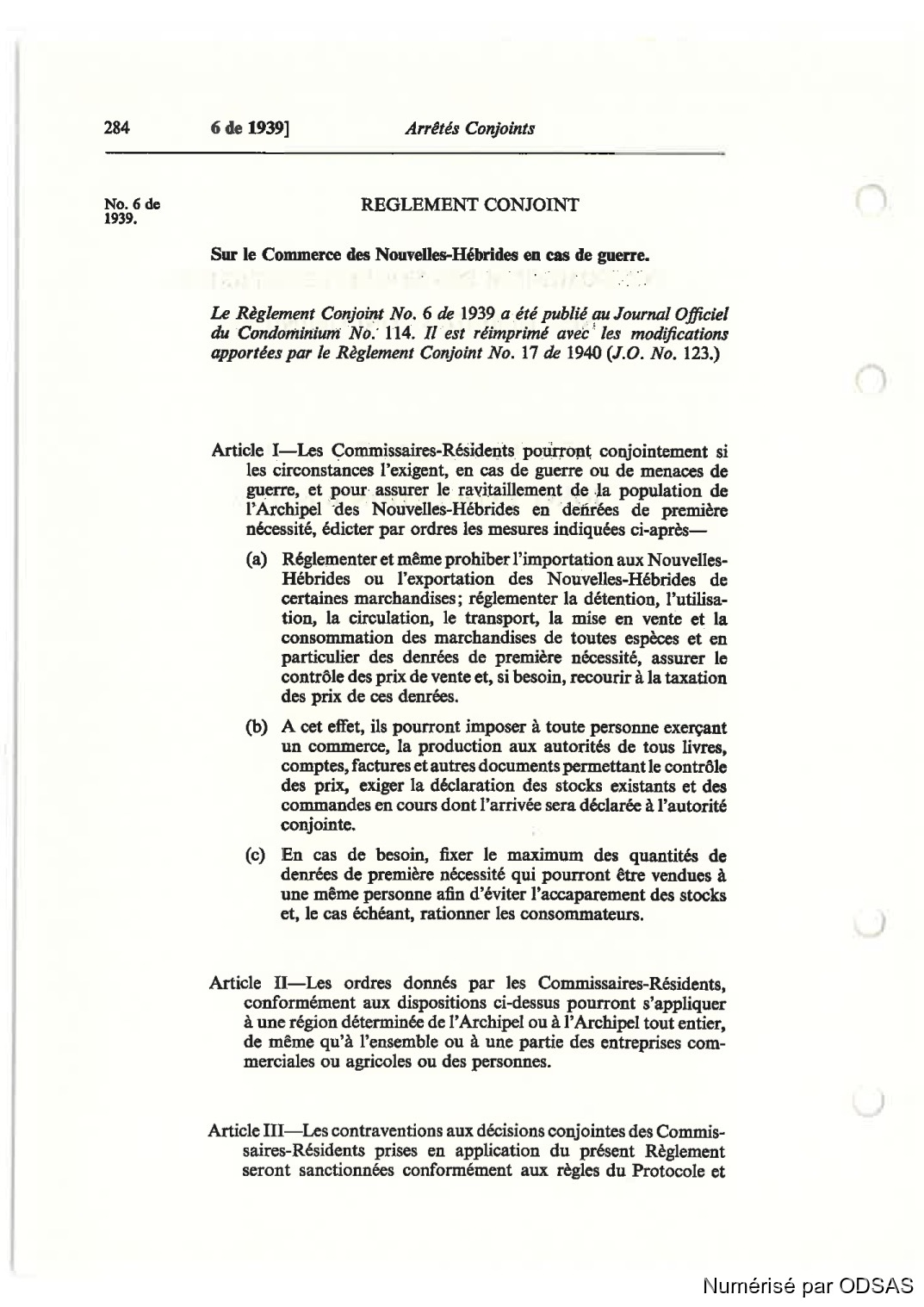 Le Règlement Conjoint No. 6 de 1939 a été publié nuJournal Ofidel
