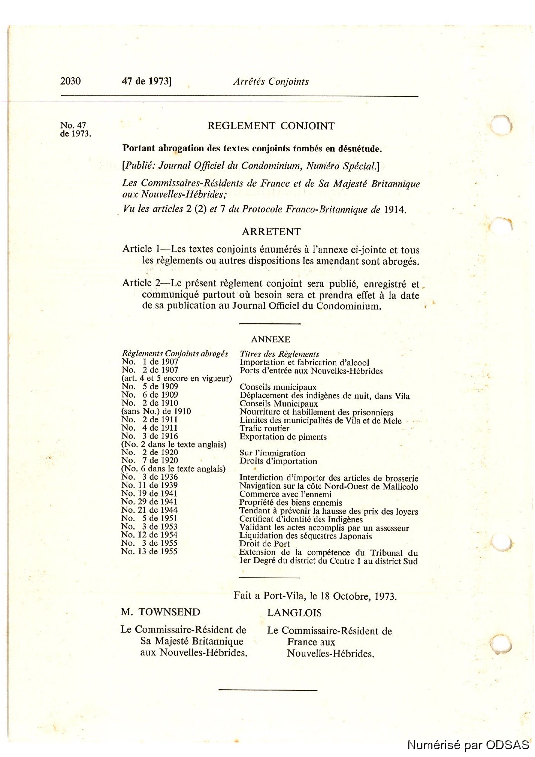 Règlementation Conjointe des Nouvelles-Hébrides...