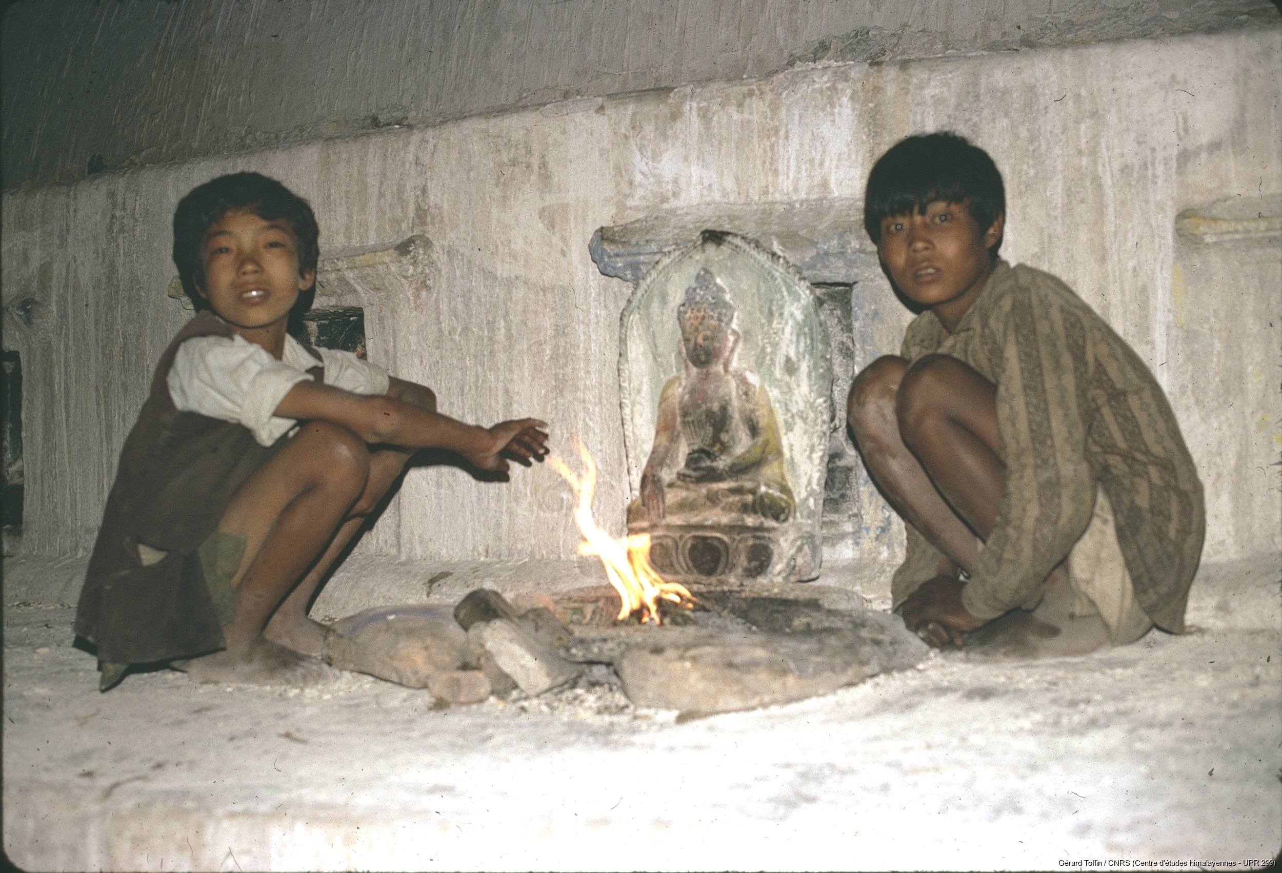 Toffin, Gérard 1974 [accessed: 2026/2/5]. "Nouvel An tibétain fêté par les Tamang au stupa de Bodnath (hiver 1974) : enfants se chauffant à un feu devant une divinité dans une niche (partie supérieure du stupa) " (Object Id: 253113). In