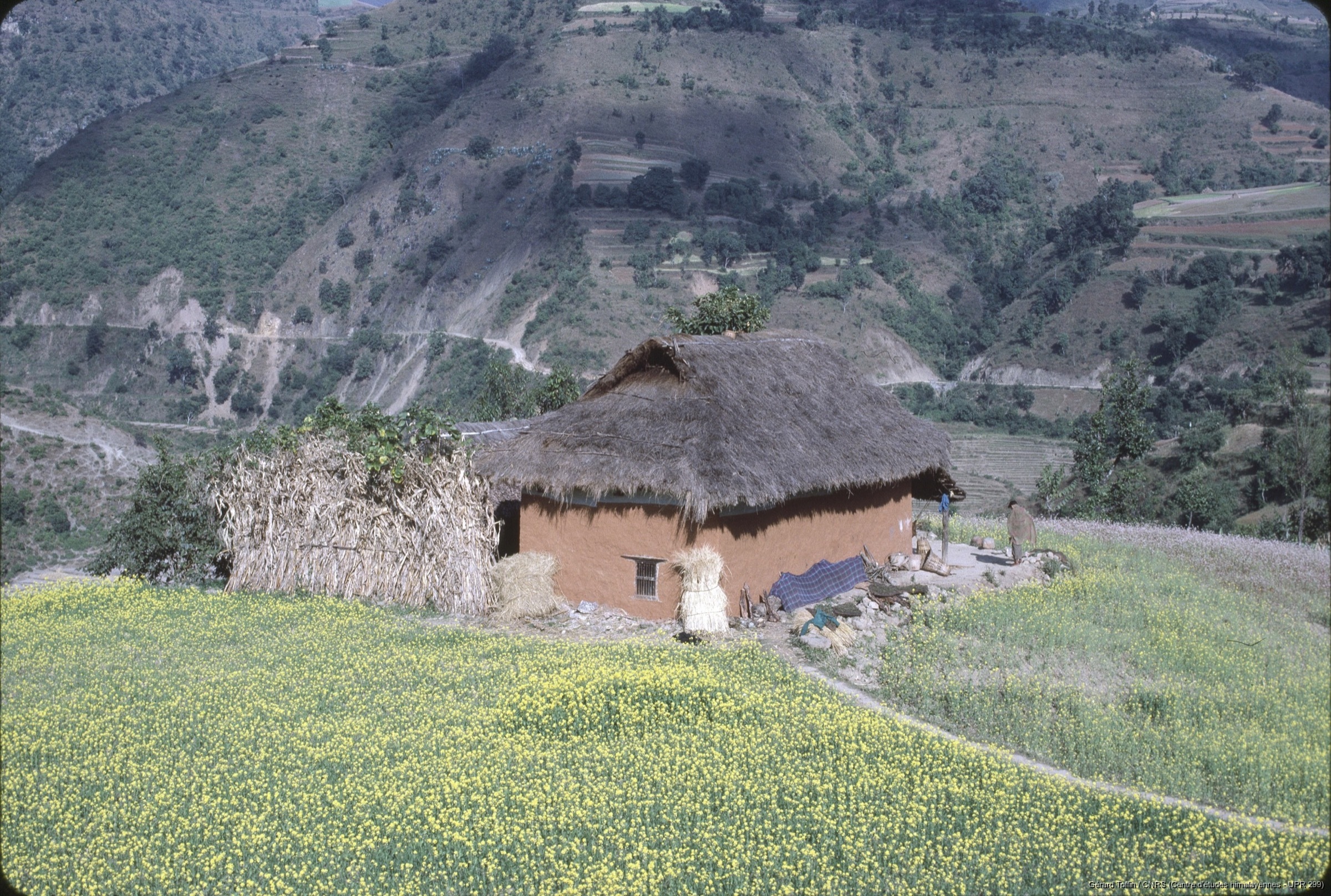 Quote this document Toffin, Gérard 1985 [accessed: 2026/2/5]. "Maison isolée en basse altitude, sur la route de l'Ankhu Khola. Maison typique parbatya (caste ido-népalaise des paysans) avec son toit de chaume et sa fenêtre unique. Elle est entourée d'une véranda sous laquelle sont entreposés du fourrage et des doko (hottes), avec un goth (enclos pour le bétail) qu'on devine à l'arrière. Située en basse altitude, à l'entrée de la vallée de l'Ankhu khola (environs de Darkha) : tournesols (premier plan), cultures en terrasses et agaves (arrière plan) " (Object Id: 253119). In Album Tamang (1974-1985). ODSAS: https://www.odsas.net/object/253119.
