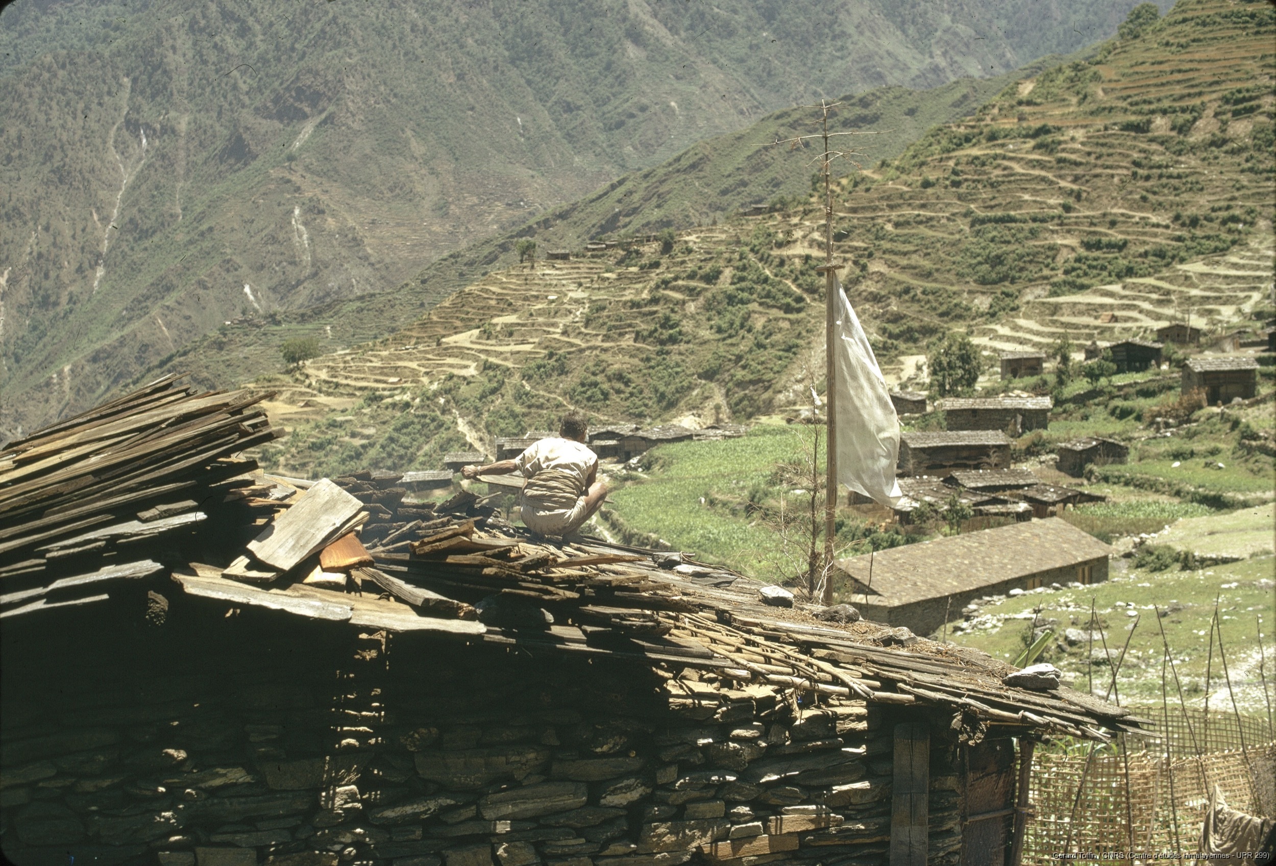 Quote this document Toffin, Gérard 1974 [accessed: 2026/2/5]. "Réfection d'un toit en bardeaux" (Object Id: 253183). In Album Tamang (1974-1985). ODSAS: https://www.odsas.net/object/253183.