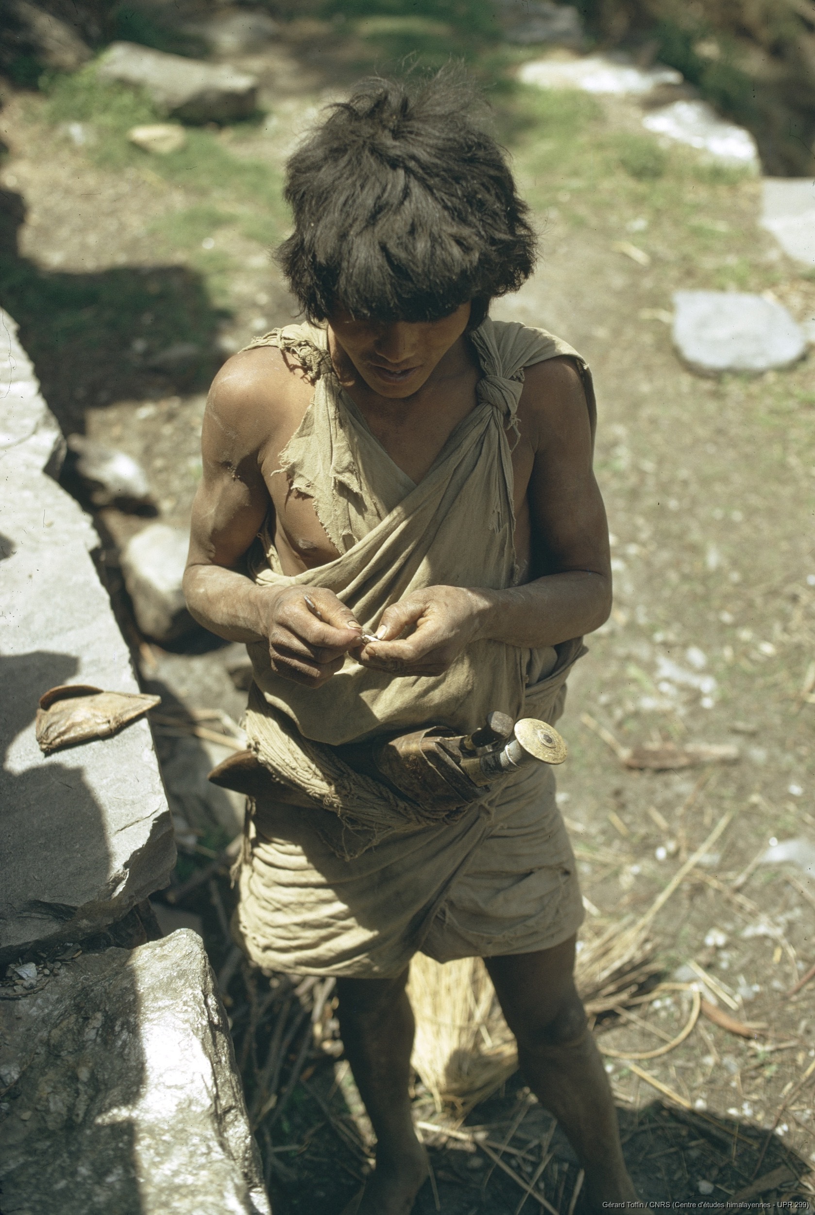 Quote this document Toffin, Gérard 1974 [accessed: 2026/2/5]. "Homme Tamang avec de l'étoupe, portant deux couteaux à la ceinture " (Object Id: 253200). In Album Tamang (1974-1985). ODSAS: https://www.odsas.net/object/253200.