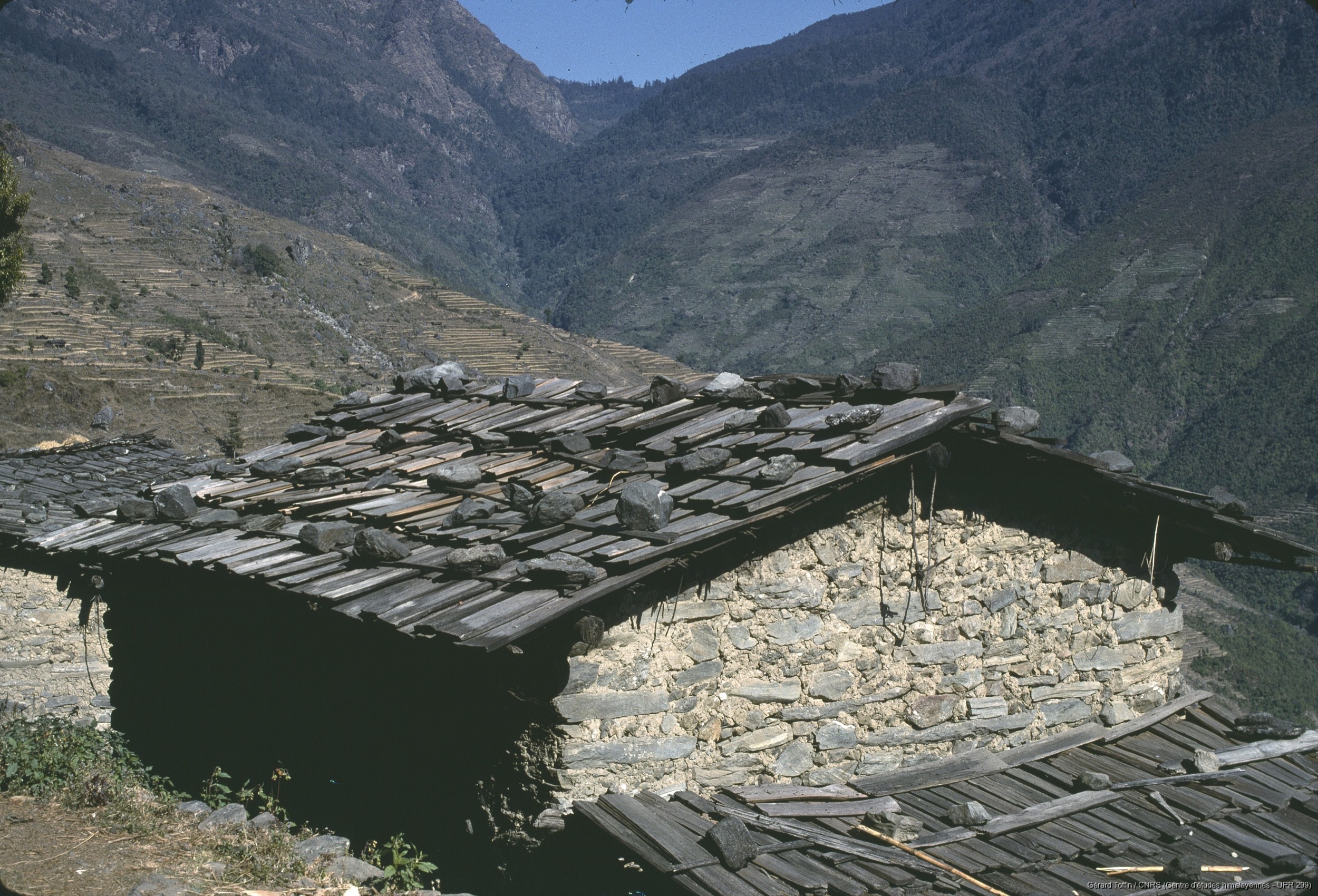 Album Tamang (1974-1985) / Maison traditionnelle typique, avec toit en bardeaux, dans la vallée de la Salankhu Khola  / Toffin, Gérard  / Salme (Nuwakot district), Népal
