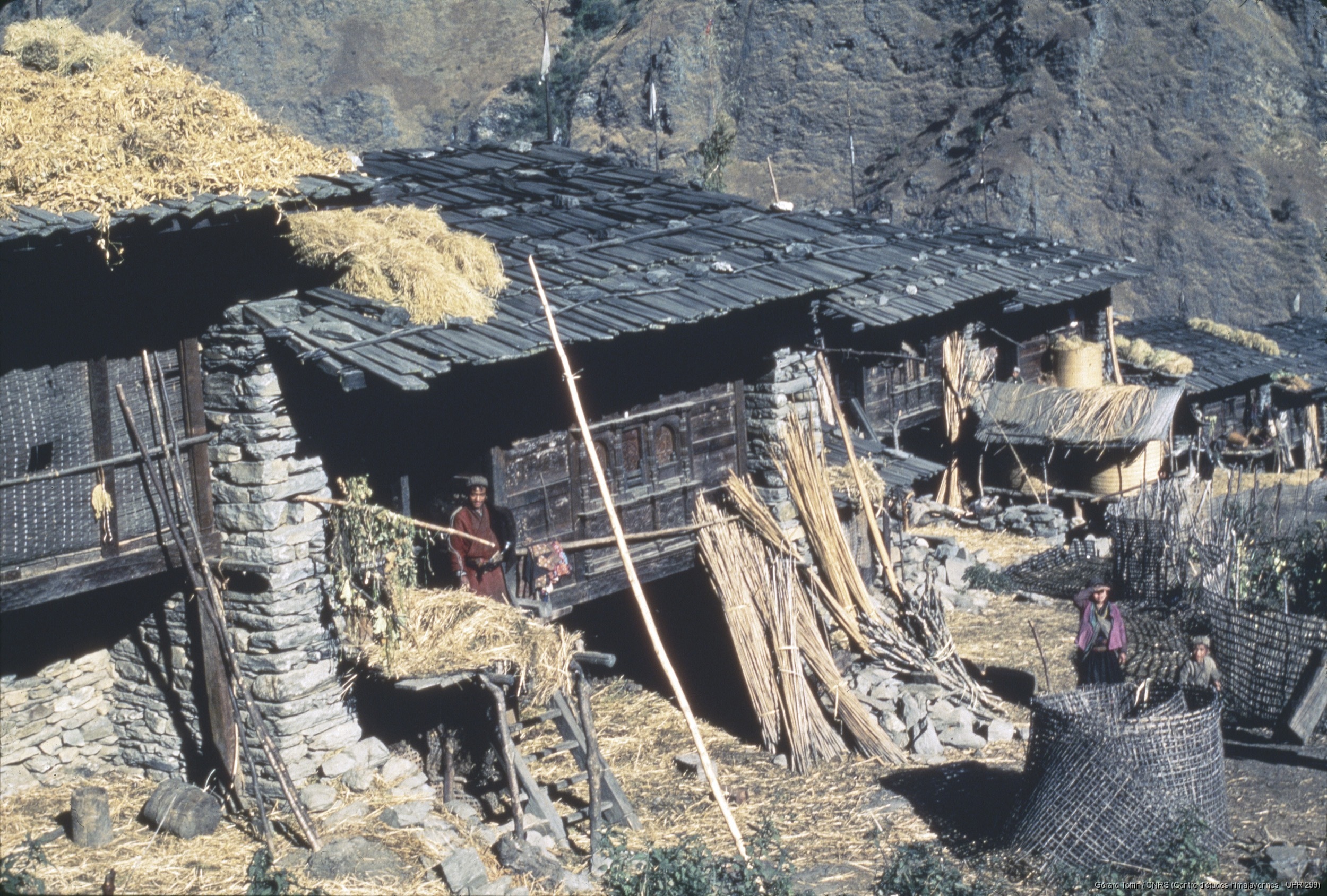 Quote this document Toffin, Gérard 1983 (?) [accessed: 2026/2/5]. "Gatlang : bambou sèche au-dessus du foyer et en extérieur. Paille sur les toits. Enclos clos pour préserver les cultures des animaux, enclos et cloisons extérieurs. Maisons traditionnelles avec toit en bardeaux avec pierre, murs non jointoyé " (Object Id: 253410). In Album Tamang (1974-1985). ODSAS: https://www.odsas.net/object/253410.