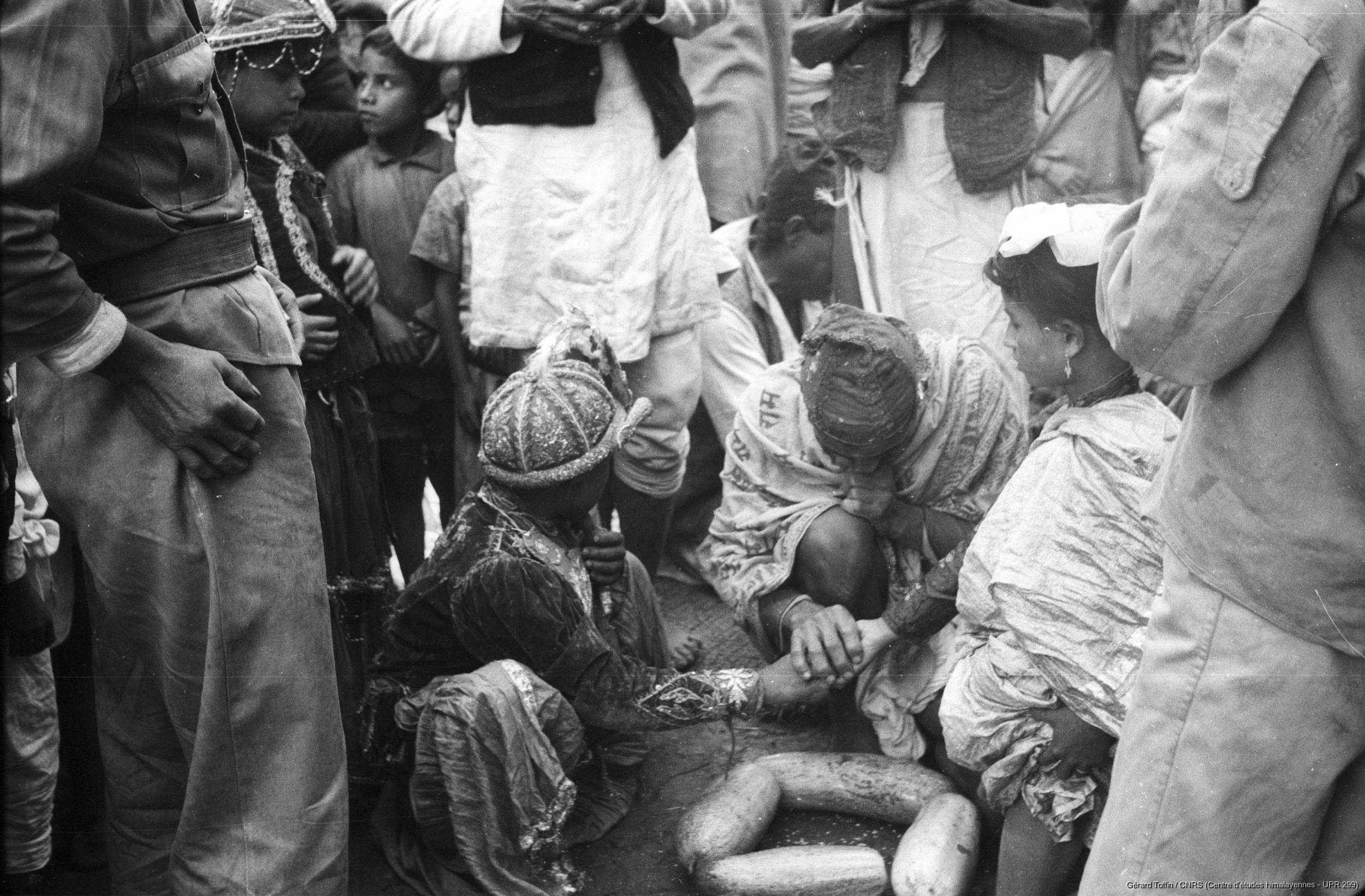 Toffin, Gérard 1971 [accessed: 2026/2/5]. "Kun pyaakhan (kũ pyākhã) lors de l'Indra Jatra : mariage princier devant les concombres. Représentation annuelle du théâtre dansé d'enfants kun pyaakhan (kũ pyākhã) lors de l'Indra Jatra. Interprété par des garçons (moins de 16 ans) choisis parmi les quatre clans shivaïtes fondateurs du village, cet art performatif a aujourd'hui disparu " (Object Id: 284217). In