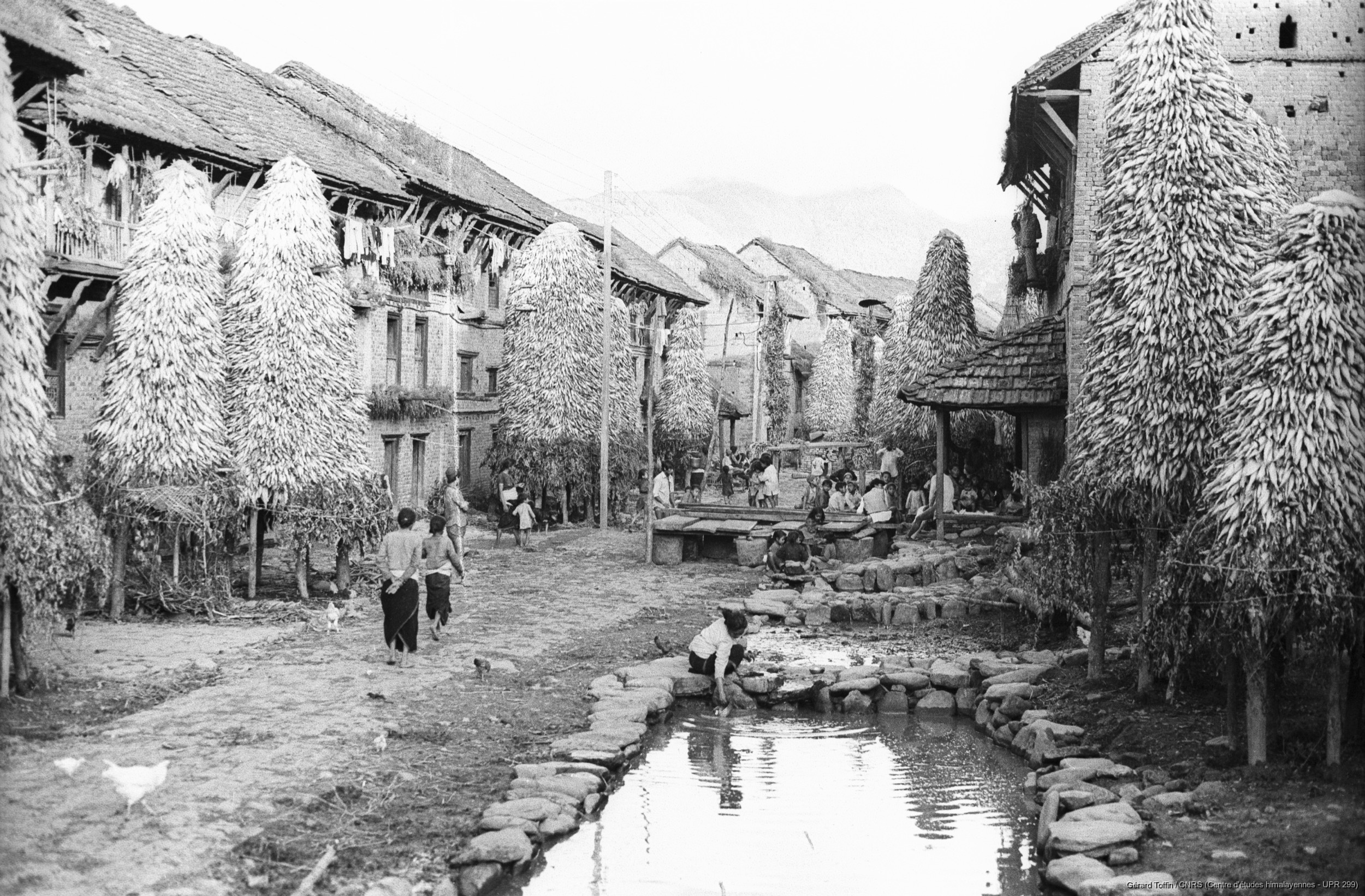 Toffin, Gérard 1975 [accessed: 2026/2/5]. "Rue unique de Pyangaon, avec séchage des épis de maïs après la récolte qui débute en août. On retrouve ce type de séchage, qui n'est pas seulemet newar, ailleurs dans les collines du Népal. Sur la droite, des plateformes (pati) de briques et de bois qui servent d'aires de repos. Généralement construites pas des particuliers à l'occasion de l'Indra Jatra, elles ont un usage tant rituel (l'image du dieu y est exposée une heure durant la procession) que profane (s'y pratiquent le tissage ou la vannerie) " (Object Id: 284239). In