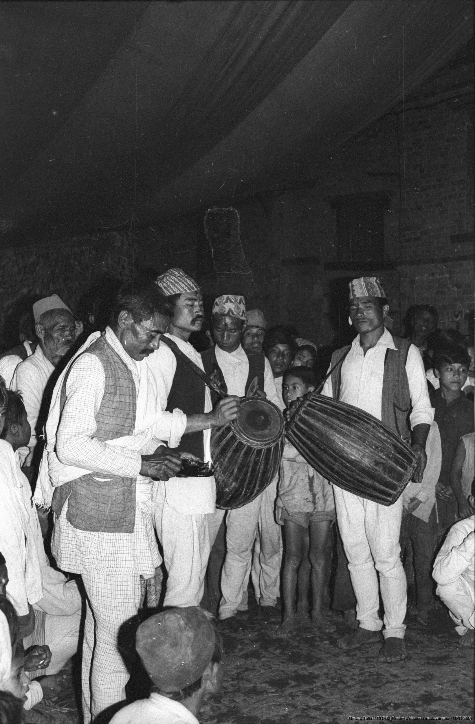 Toffin, Gérard 1975 [accessed: 2026/2/5]. "Kun pyaakhan (kũ pyākhã) lors de l'Indra Jatra : musiciens. Représentation annuelle du théâtre dansé d'enfants kun pyaakhan (kũ pyākhã) lors de l'Indra Jatra. Interprété par des garçons (moins de 16 ans) choisis parmi les quatre clans shivaïtes fondateurs du village, cet art performatif a aujourd'hui disparu " (Object Id: 284256). In