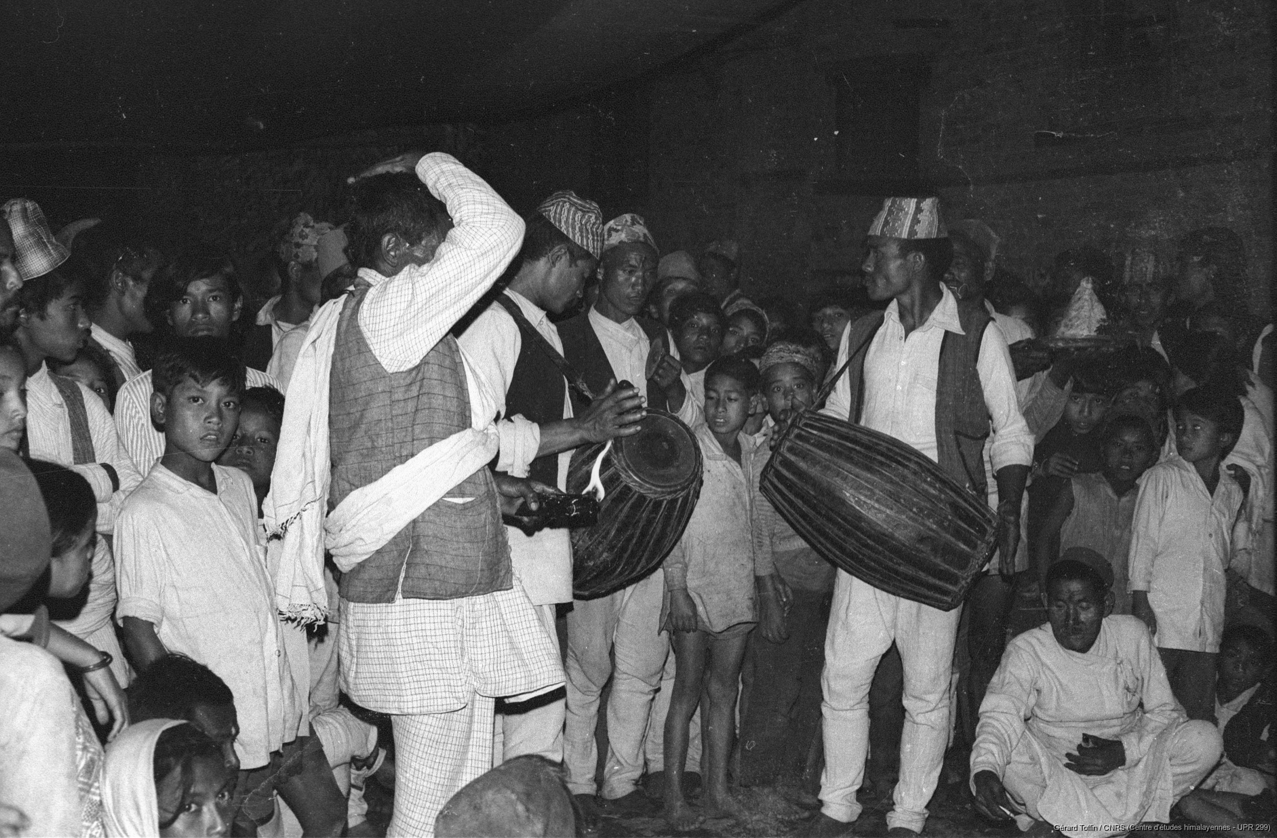 Toffin, Gérard 1975 [accessed: 2026/2/5]. "Kun pyaakhan (kũ pyākhã) lors de l'Indra Jatra : musiciens. Représentation annuelle du théâtre dansé d'enfants kun pyaakhan (kũ pyākhã) lors de l'Indra Jatra. Interprété par des garçons (moins de 16 ans) choisis parmi les quatre clans shivaïtes fondateurs du village, cet art performatif a aujourd'hui disparu " (Object Id: 284257). In