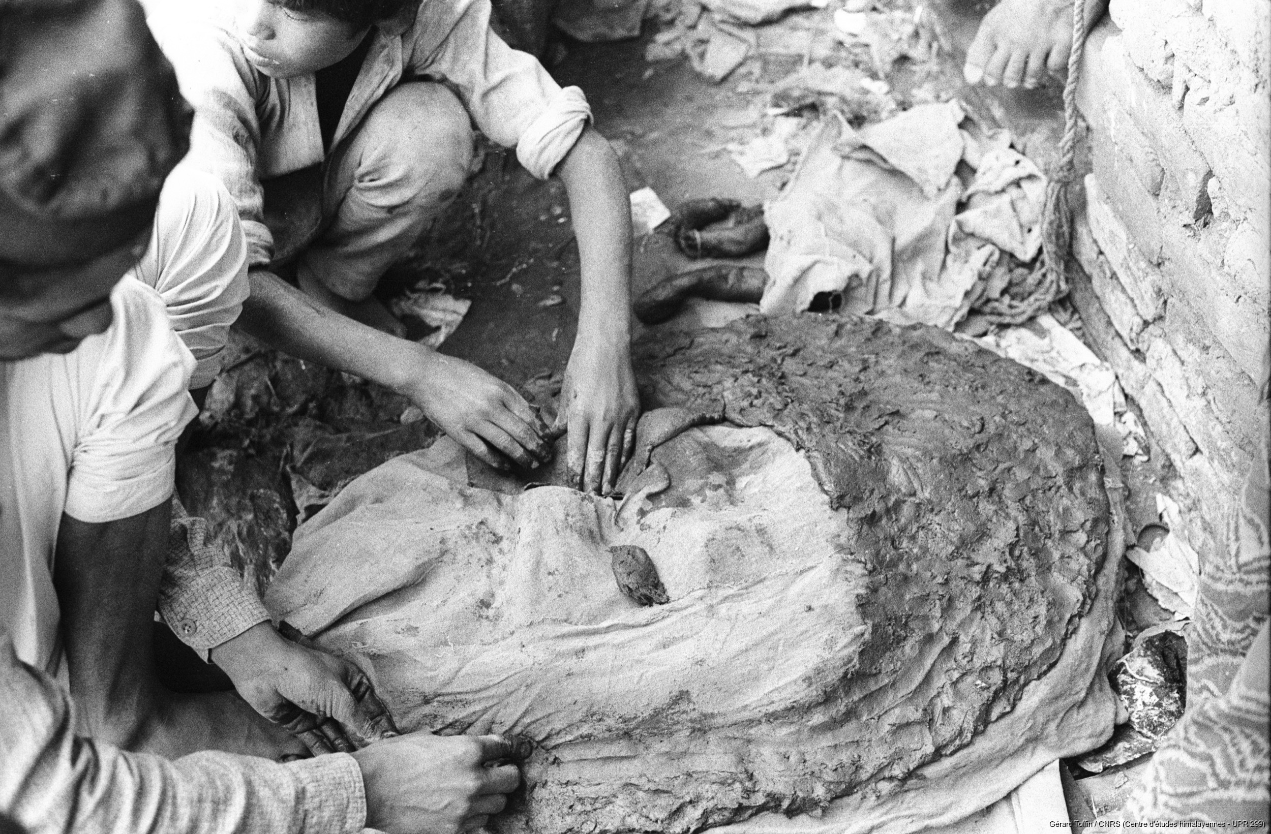 Quote this document Toffin, Gérard 1974 [accessed: 2026/2/5]. "Fabrication de masques rituels par les Citrakar : l'argile, sous forme de boudin, est appliquée sur le modèle recouvert d'un tissu. Fabrication de masques rituels par la caste des Citrakar ("fabricants d'images"), dans le village de potiers de Thimi" (Object Id: 284307). In Fabrication des masques rituels (1974). ODSAS: https://www.odsas.net/object/284307.