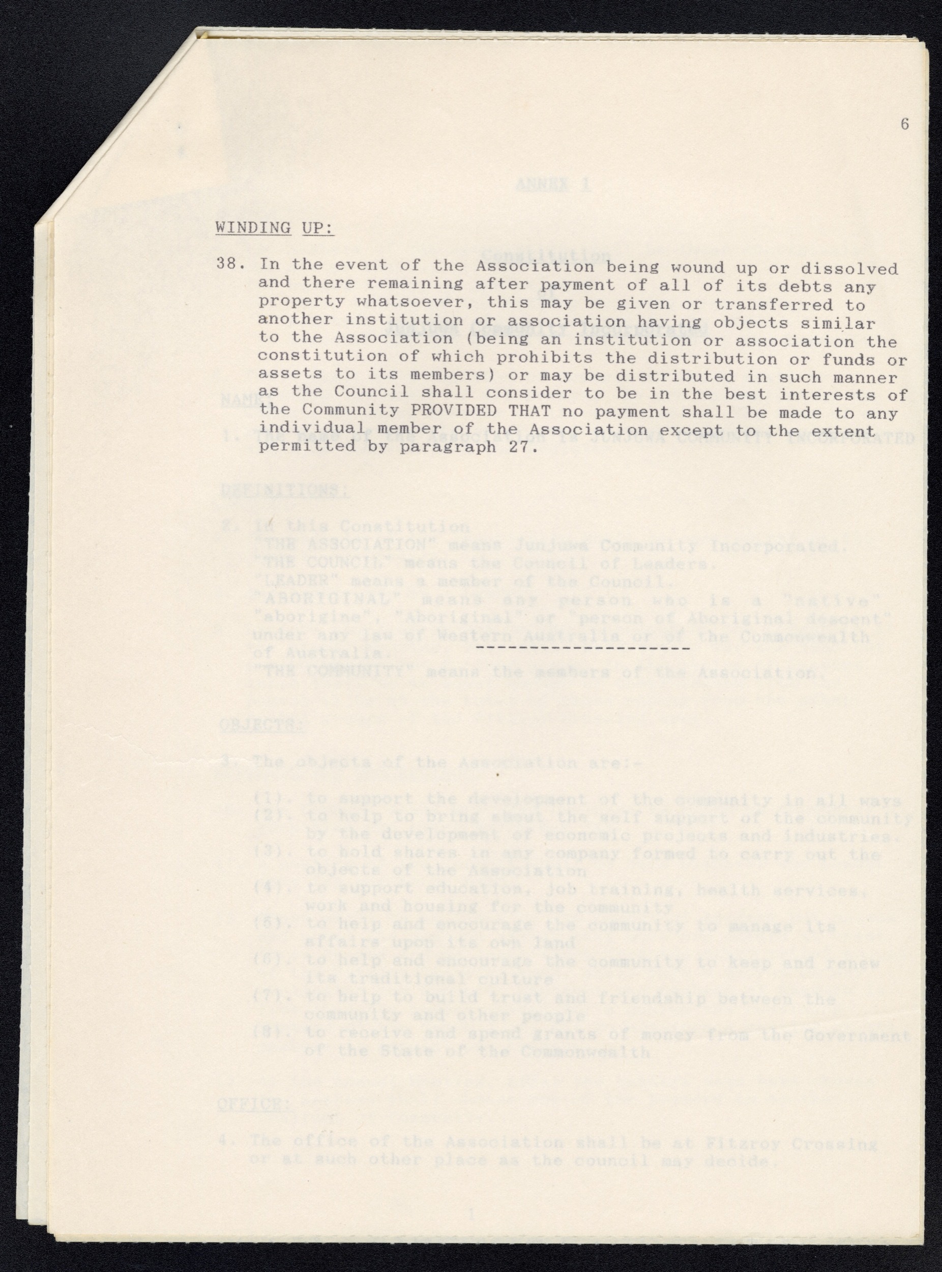 Quote this document [accessed: 2026/4/29]. "Constitution of Junjuwa Community Incorporated" (Object Id: 314600). In Constitution of Junjuwa Community Incorporated. ODSAS: https://www.odsas.net/object/314600.