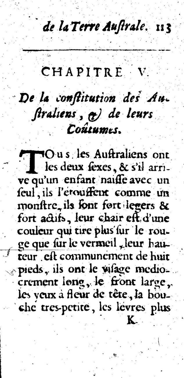 De Foigny, Gabriel 1692 [accessed: 2026/4/18]. "Chapitre V. De la constitution des Australiens, et de leurs Coutumes" (Object Id: 3971). In