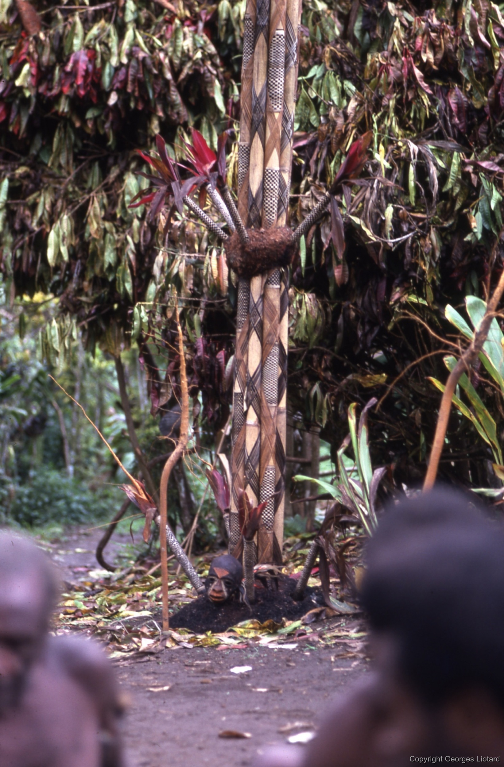 Au pied d'un grand mât en bambou au sommet duquel se trouve le mannequin. On aperçoit un crâne surmodelé et des vanneries à la base des mâts (bambou).