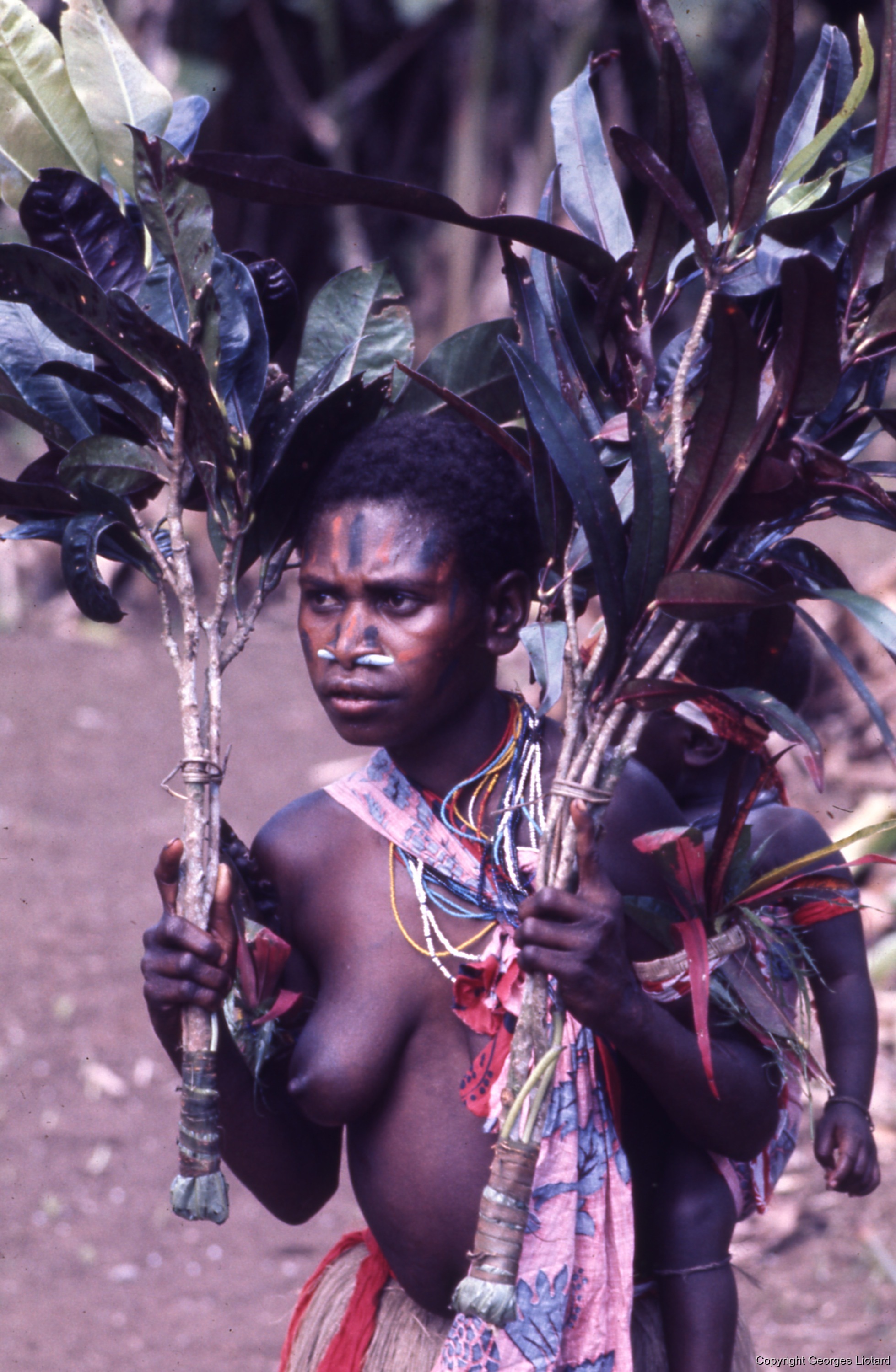 Quote this document Liotard, Georges 1974 [accessed: 2026/3/5]. "Jeune femme: Jeune femme visage peint portant un enfant dans le dos et brandissant des rameaux de feuille de croton." (Object Id: 46620). In Funérailles à  Malakula (Malekula, Mallicolo) Vanuatu. ODSAS: https://www.odsas.net/object/46620.