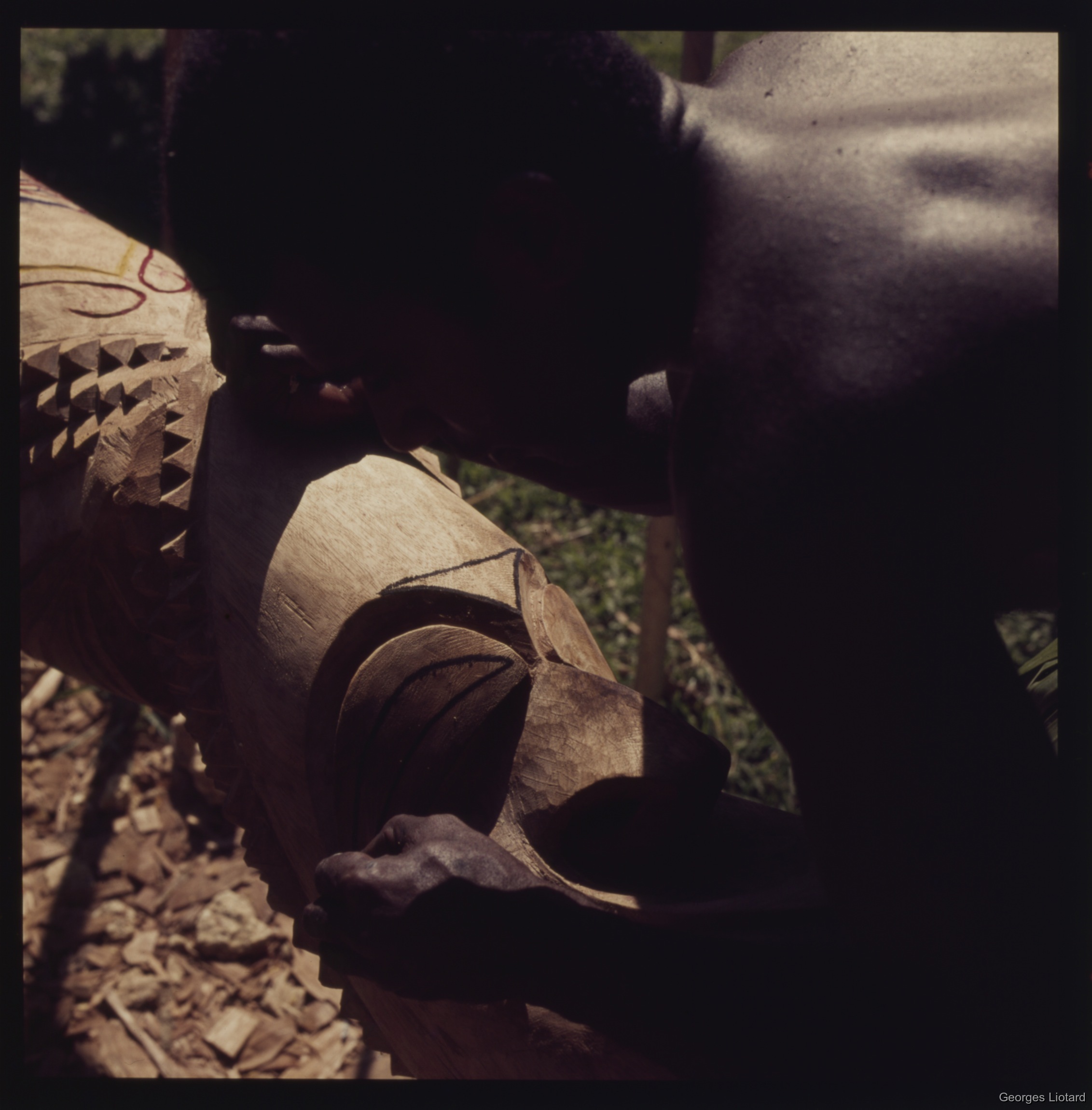 Liotard, Georges 1968-1976 [accessed: 2026/4/19]. "Le sculpteur du village de Fantan "Steveen Bae" en train de dessiner et colorier en rouge la pastille d'un tambour monumental à trois têtes qu'il vient d'achever" (Object Id: 63909). In