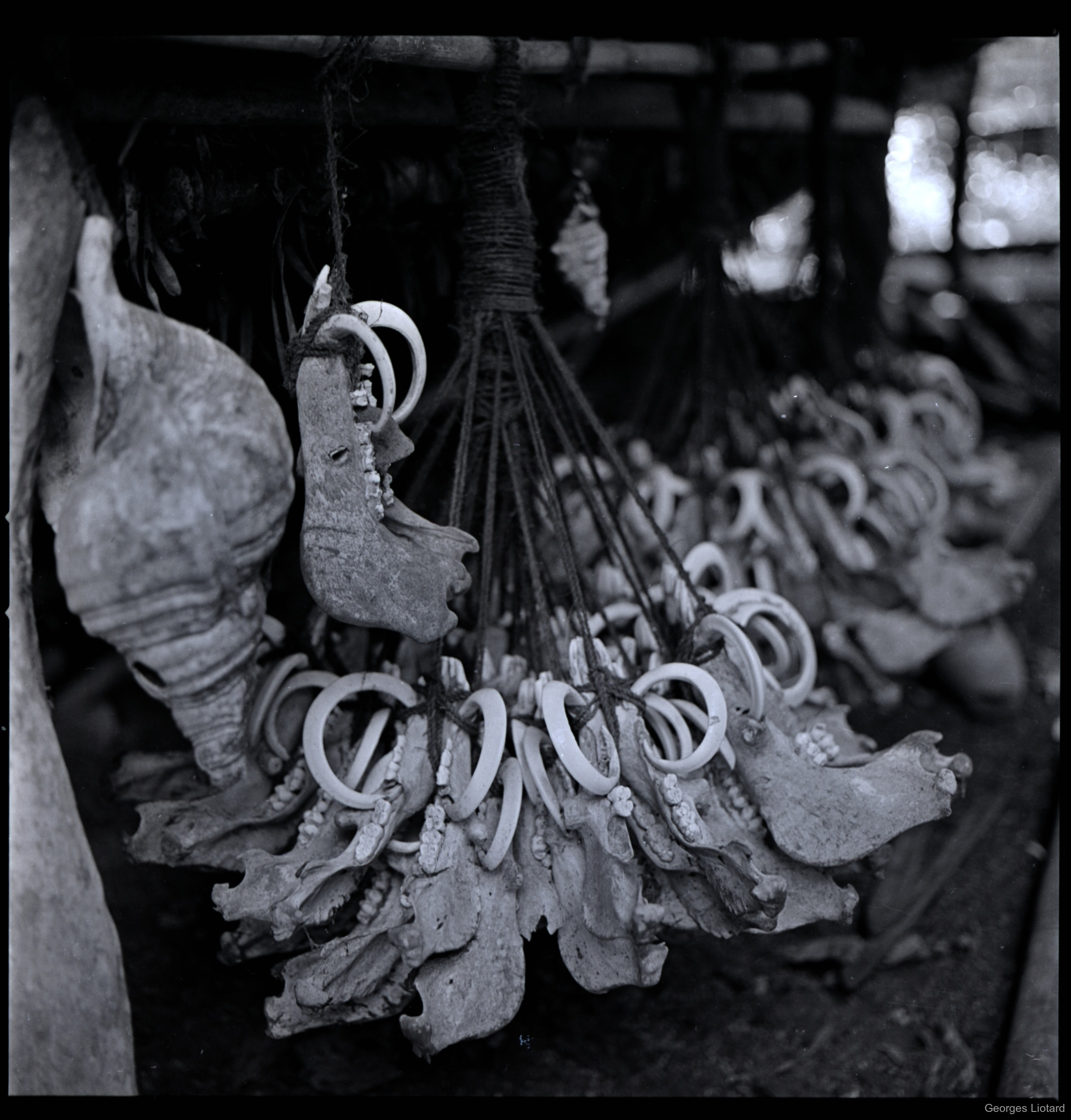 Liotard, Georges 20 novembre 1974 [accessed: 2026/1/23]. "Le petit auvent, au toit duquel sont suspendus de nombreux pendants de mach (signe du haut grade obtenu). Y sont également suspendus des coquillages (conques et araignées de mer). Posés à même le sol, on voit des assomoirs en bois en forme de matraque" (Object Id: 63983). In