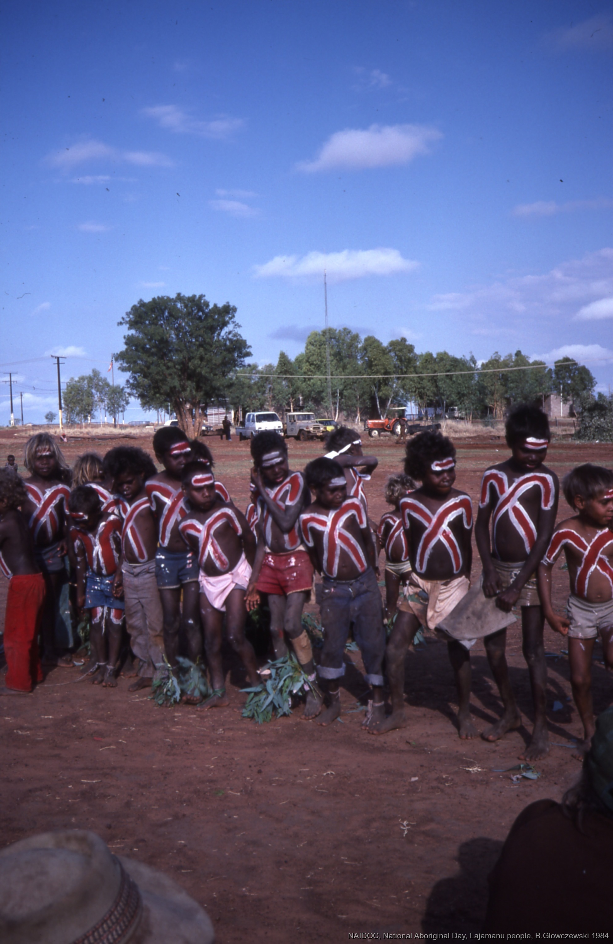 Quote this document Glowczewski, Barbara 1984/09/12 [accessed: 2026/1/30]. "boys painted WARLU (Fire)/PIRNTINA dance Jurntu; Children and adults celebrate the end of School" (Object Id: 84679). In NAIDOC: National Aboriginal Day, Lajamanu and Katherine, 1984 (photos). ODSAS: https://www.odsas.net/object/84679.