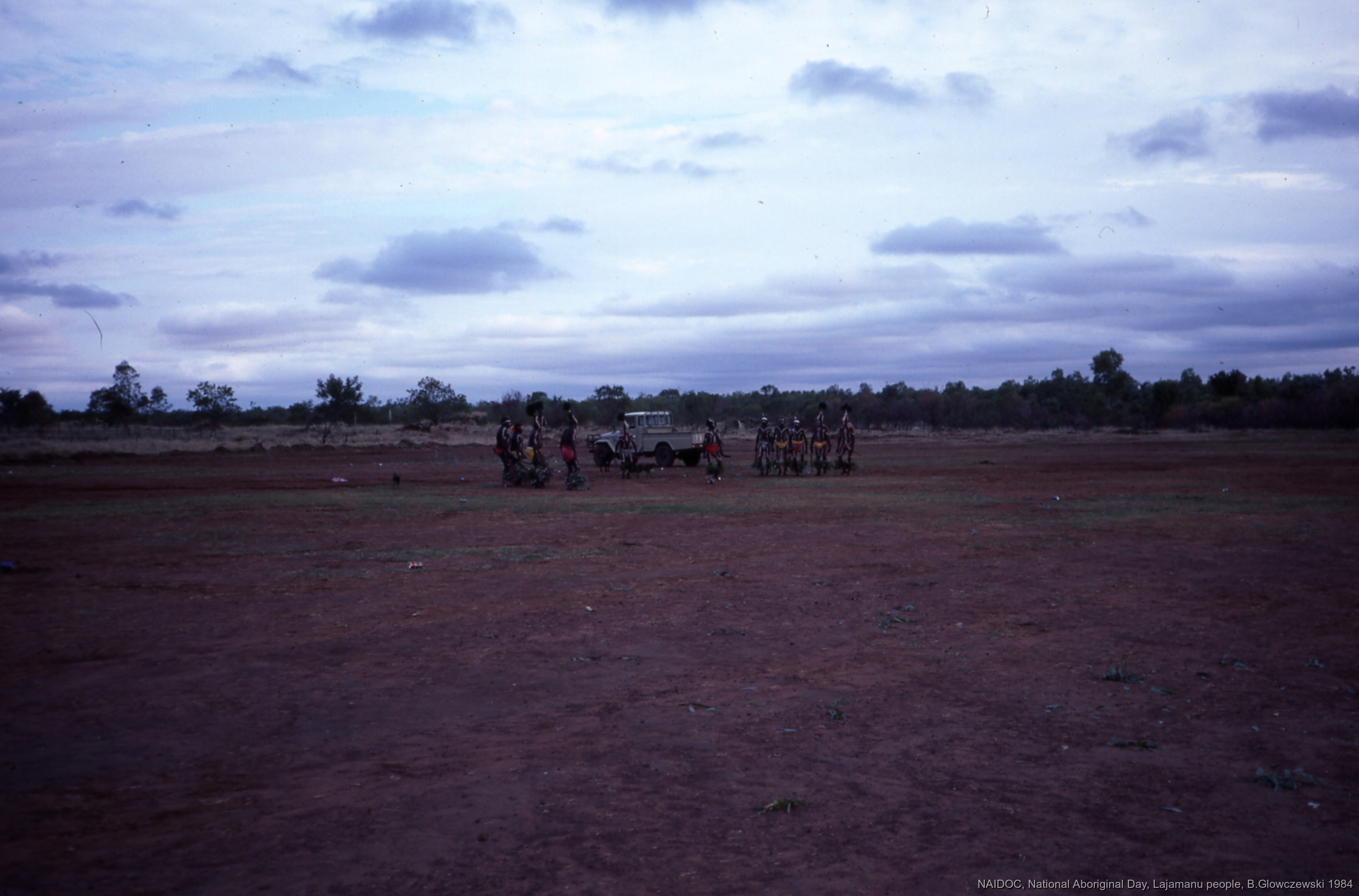 Quote this document Glowczewski, Barbara 1984/09/12 [accessed: 2026/1/30]. "Men dance Jurntu purlapa. Children and adults celebrate the end of School" (Object Id: 84695). In NAIDOC: National Aboriginal Day, Lajamanu and Katherine, 1984 (photos). ODSAS: https://www.odsas.net/object/84695.