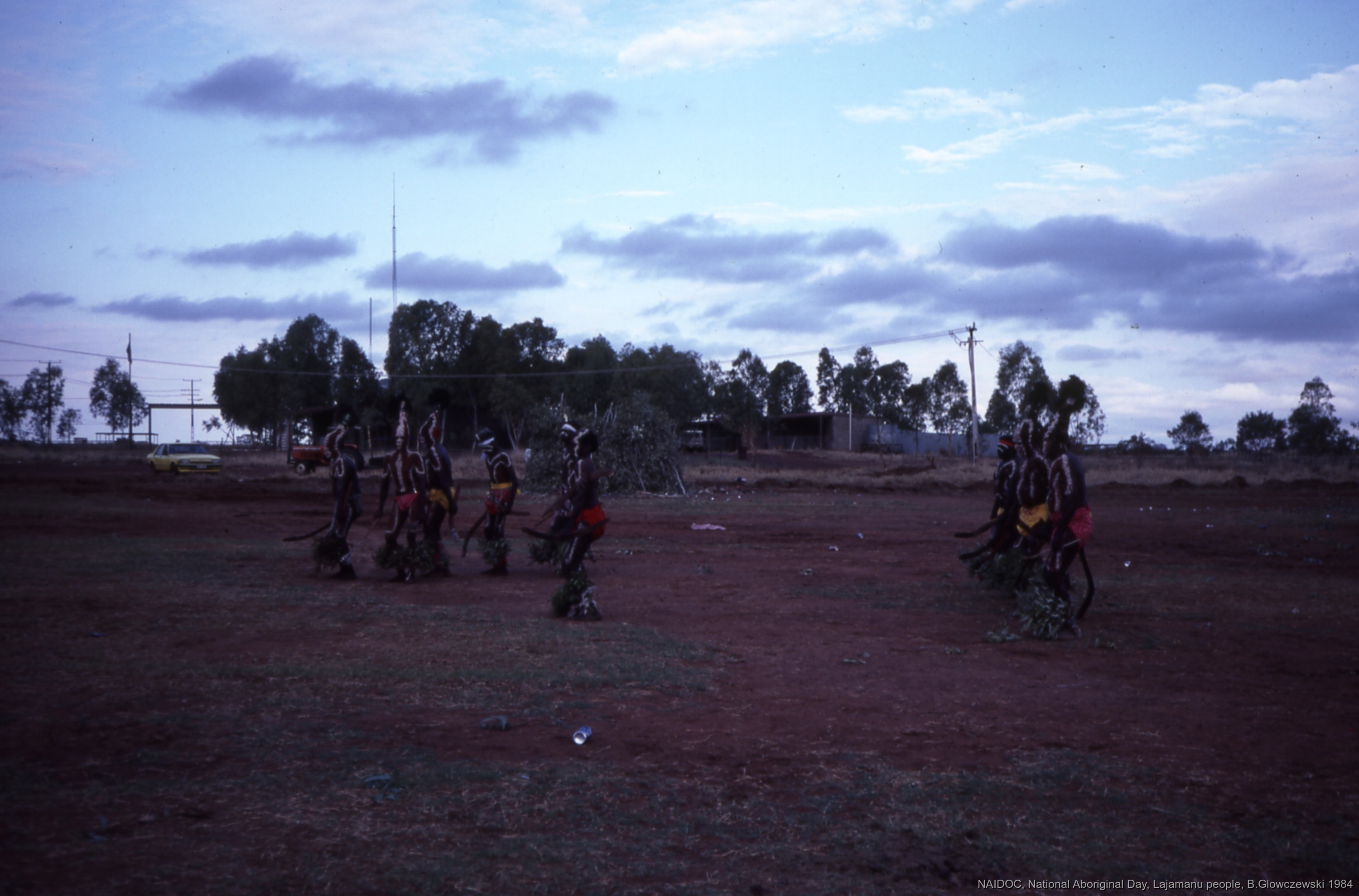 NAIDOC: National Aboriginal Day, Lajamanu and Katherine, 1984 (photos) / Men dance Jurntu purlapa. Children and adults celebrate the end of School / Barbara Glowczewski / Lajamanu, Tanami Desert, Central Australia, NT