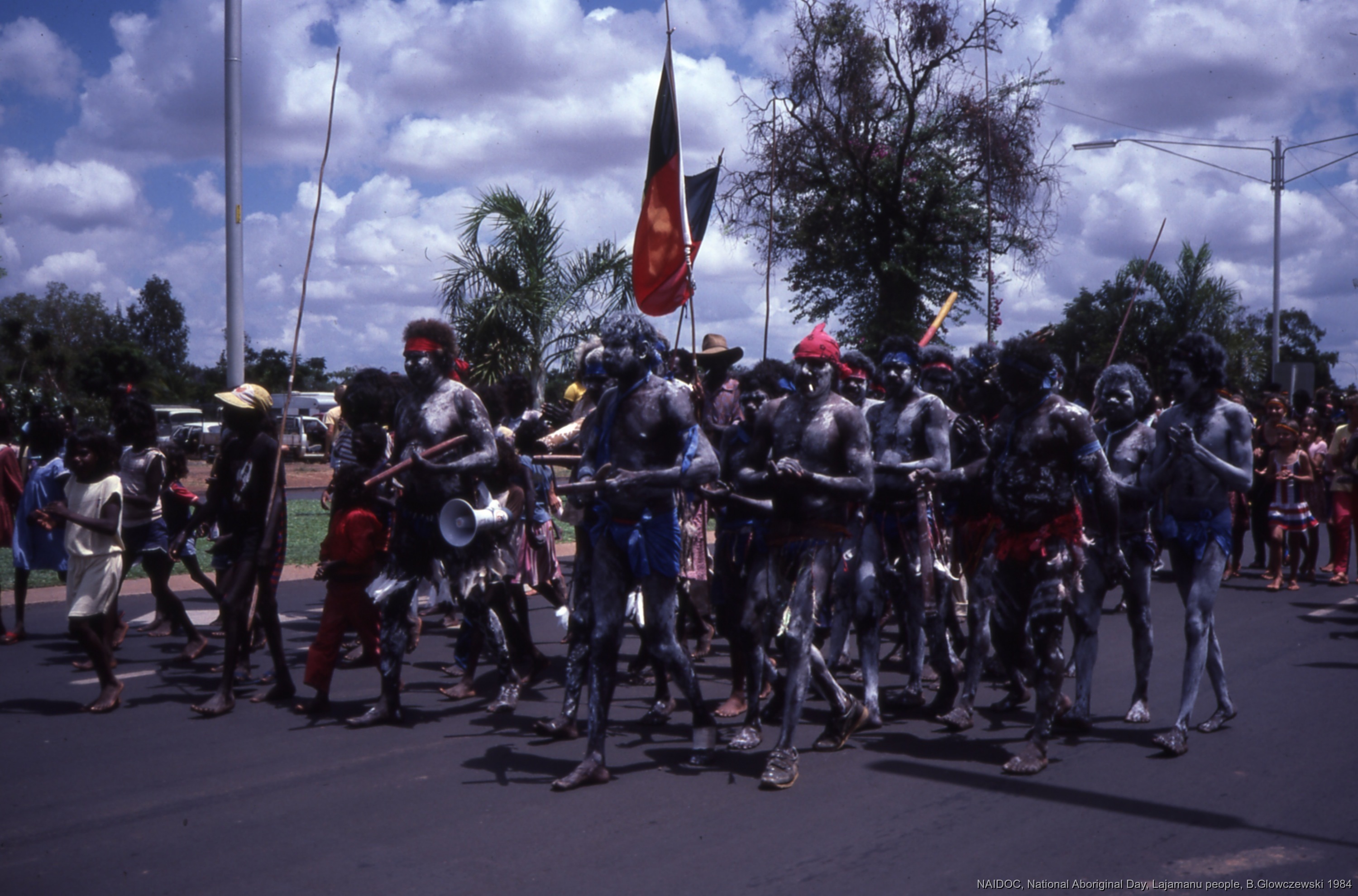 Glowczewski, Barbara 1984/09/14 [accessed: 2026/1/30]. "Bamyili dancers march with the Aboriginal flag for NAIDOC" (Object Id: 84751). In