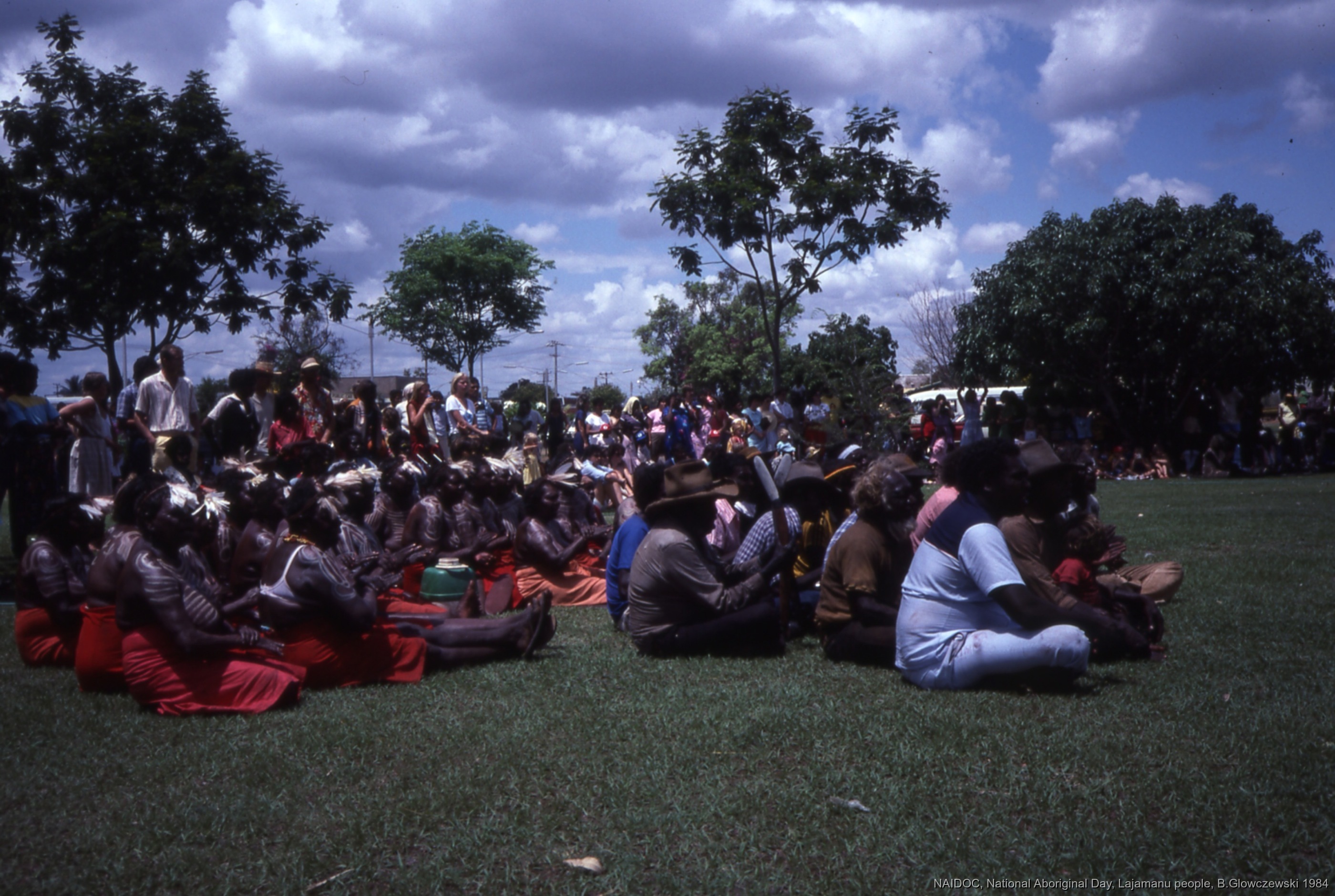 Glowczewski, Barbara 1984/09/14 [accessed: 2026/1/30]. "Lajamanu men and women sing for Jurntu purlapa. Public performance for NAIDOC" (Object Id: 84769). In