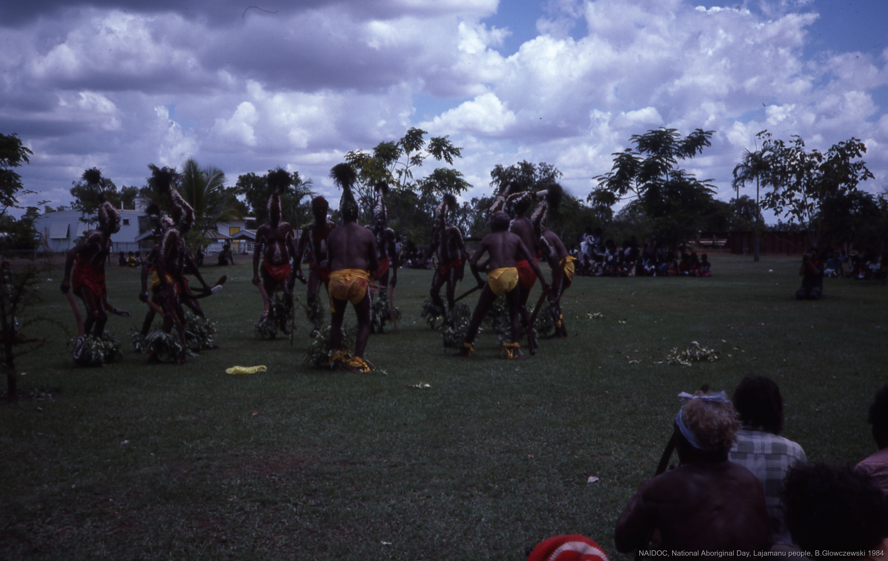 Glowczewski, Barbara 1984/09/14 [accessed: 2026/1/30]. "Lajamanu men dance Jurntu purlapa. Public performance for NAIDOC" (Object Id: 84776). In