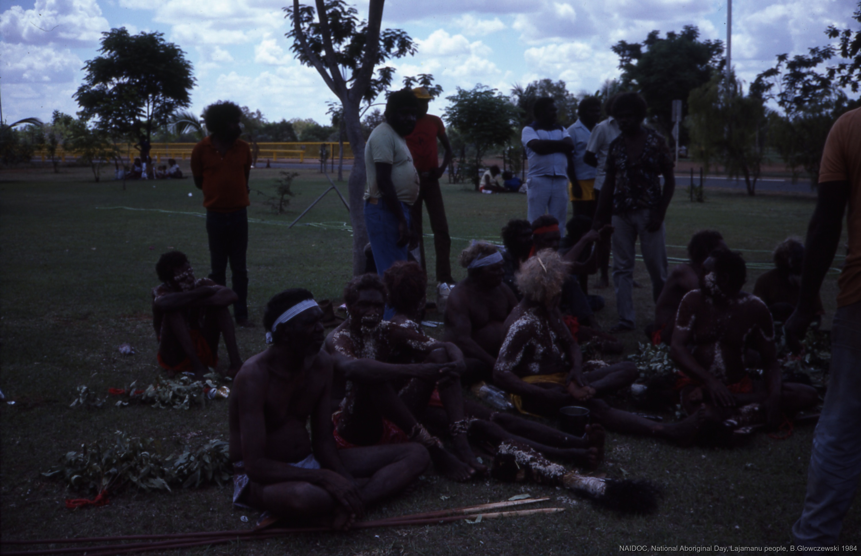 NAIDOC: National Aboriginal Day, Lajamanu and Katherine, 1984 (photos) / Men after their dance.  / Barbara Glowczewski / Mimi arts, streets and park of Katherine, NT