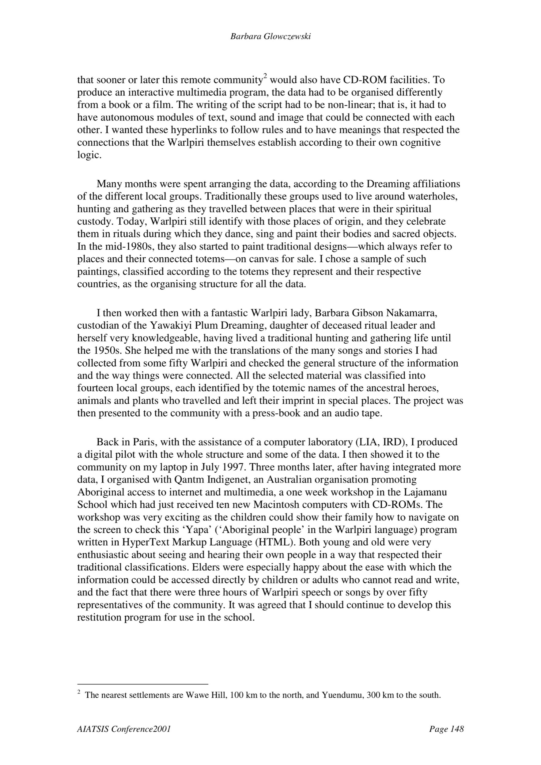 that sooner or later this remote community2 would also have CD-ROM facilities. To produce an interactive multimedia program, the data had to be organised differently from a book or a film. The writing of the script had to be non-linear; that is, it had to have autonomous modules of text, sound and image that could be connected with each other. I wanted these hyperlinks to follow rules and to have meanings that respected the connections that the Warlpiri themselves establish according to their own cognitive logic. Many months were spent arranging the data, according to the Dreaming affiliations of the different local groups. Traditionally these groups used to live around waterholes, hunting and gathering as they travelled between places that were in their spiritual custody. Today, Warlpiri still identify with those places of origin, and they celebrate them in rituals during which they dance, sing and paint their bodies and sacred objects. In the mid-1980s, they also started to paint traditional designs—which always refer to places and their connected totems—on canvas for sale. I chose a sample of such paintings, classified according to the totems they represent and their respective countries, as the organising structure for all the data. I then worked then with a fantastic Warlpiri lady, Barbara Gibson Nakamarra, custodian of the Yawakiyi Plum Dreaming, daughter of deceased ritual leader and herself very knowledgeable, having lived a traditional hunting and gathering life until the 1950s. She helped me with the translations of the many songs and stories I had collected from some fifty Warlpiri and checked the general structure of the information and the way things were connected. All the selected material was classified into fourteen local groups, each identified by the totemic names of the ancestral heroes, animals and plants who travelled and left their imprint in special places. The project was then presented to the community with a press-book and an audio tape. Back in Paris, with the assistance of a computer laboratory (LIA, IRD), I produced a digital pilot with the whole structure and some of the data. I then showed it to the community on my laptop in July 1997. Three months later, after having integrated more data, I organised with Qantm Indigenet, an Australian organisation promoting Aboriginal access to internet and multimedia, a one week workshop in the Lajamanu School which had just received ten new Macintosh computers with CD-ROMs. The workshop was very exciting as the children could show their family how to navigate on the screen to check this ‘Yapa’ (‘Aboriginal people’ in the Warlpiri language) program written in HyperText Markup Language (HTML). Both young and old were very enthusiastic about seeing and hearing their own people in a way that respected their traditional classifications. Elders were especially happy about the ease with which the information could be accessed directly by children or adults who cannot read and write, and the fact that there were three hours of Warlpiri speech or songs by over fifty representatives of the community. It was agreed that I should continue to develop this restitution program for use in the school. 2 The nearest settlements are Wawe Hill, 100 km to the north, and Yuendumu, 300 km to the south.