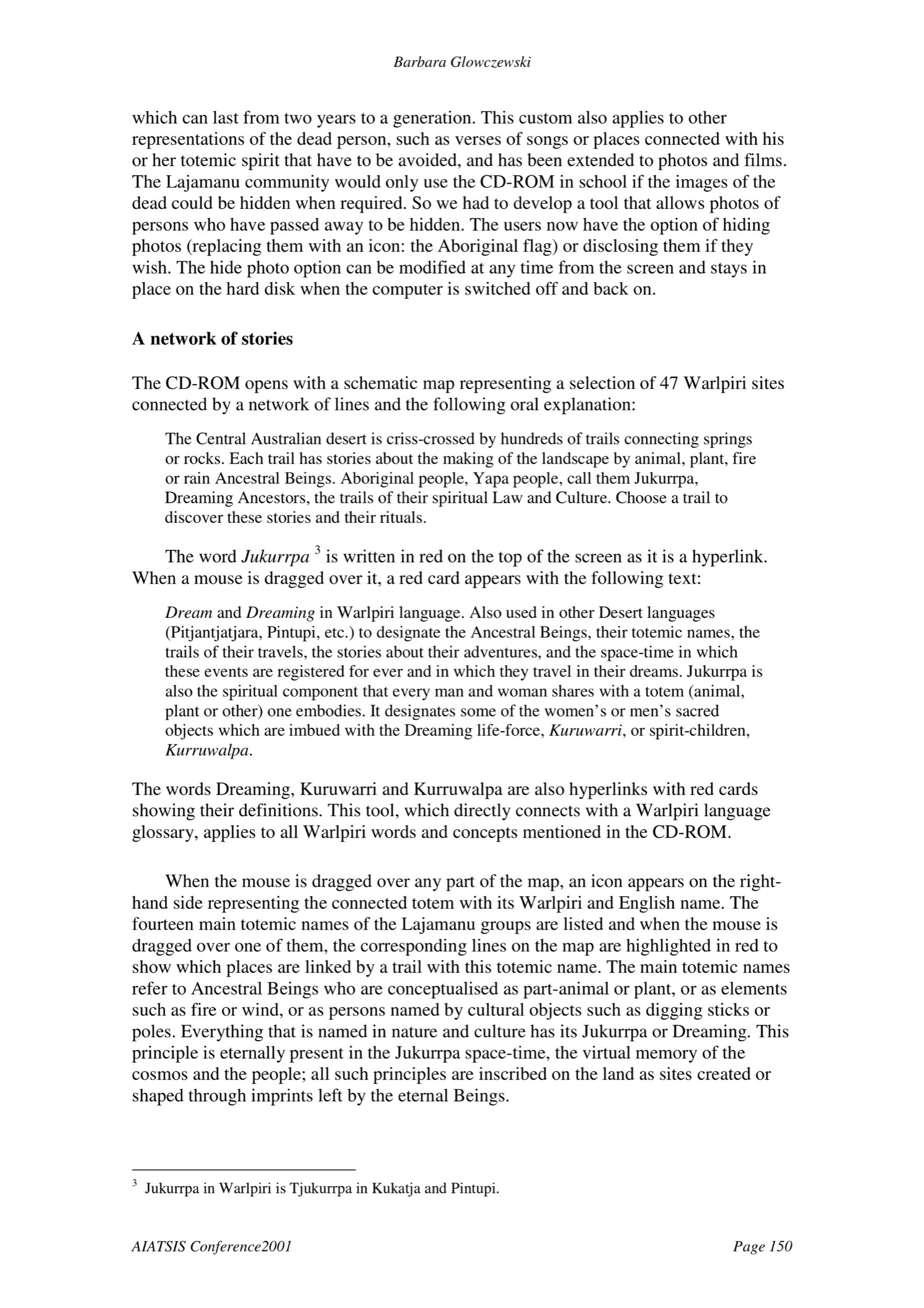 Returning Indigenous knowledge in central Australia: 'this CD-ROM brings everybody to the mind' / Returning Indigenous knowledge in central Australia. AIATSIS Conference 2001 / Barbara Glowczewski /  Australia/ Australie