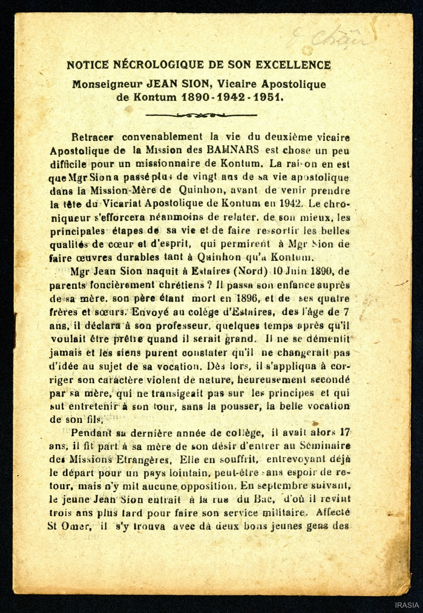 Missions : Notice nécrologique de son Excellence Monseigneur Jean Sion, Vicaire Apostolique de Kontum [Set(s) 1504]