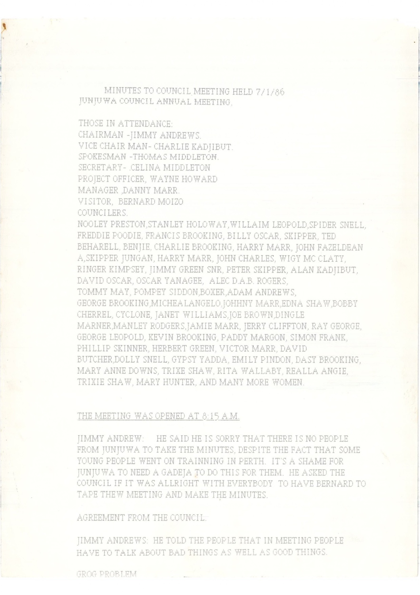 Minutes to Council Meeting held 07/01/86 - Junjuwa Council Annual Meeting [