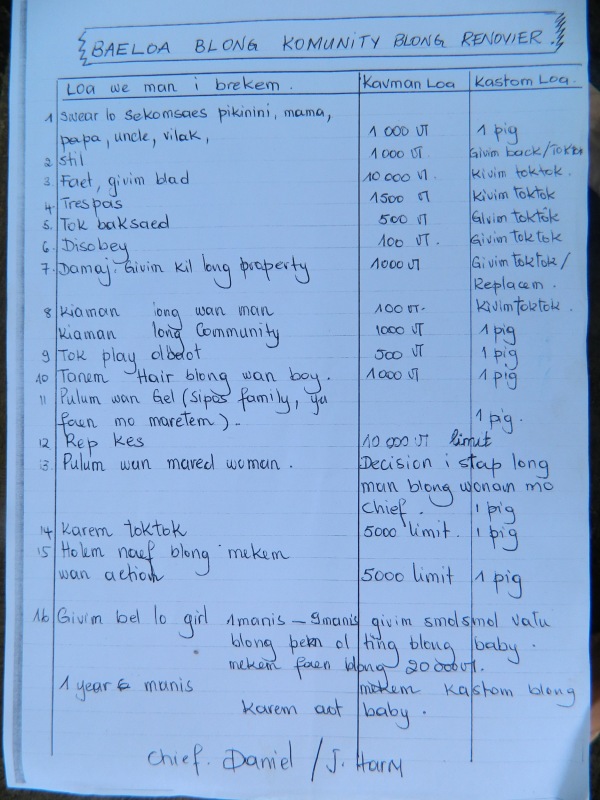 Les règles de vie de la communauté nisvai, Vanuatu 2013