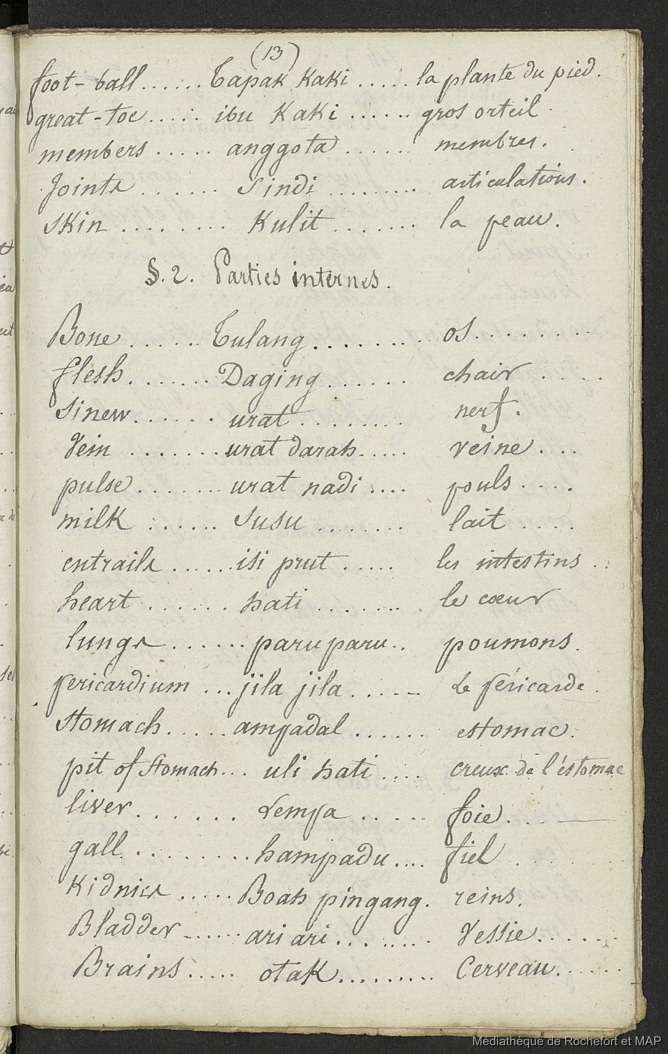 Quote this document Lesson, Pierre-Adolphe [accessed: 2026/1/29]. "Vocabulaire anglais, malais et français (B172996201_BM08191)" (Object Id: 157896). In Vocabulaire anglais, malais et français (B172996201_BM08191). ODSAS: https://www.odsas.net/object/157896.
