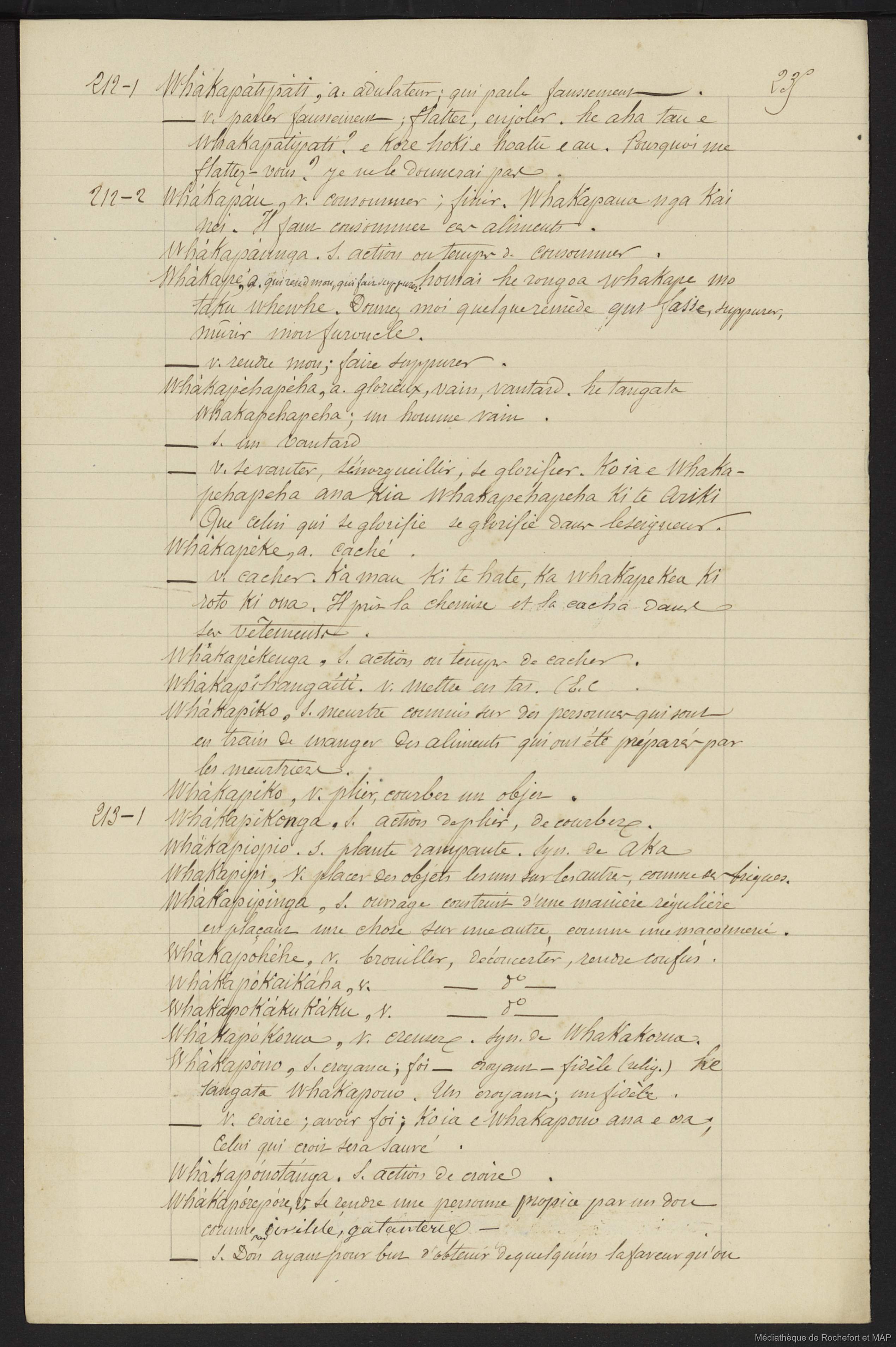 Quote this document Lesson, Pierre-Adolphe [accessed: 2026/2/11]. "Dictionnaire Français-nouveau Zélandais (B172996201_Ms00129)" (Object Id: 159804). In Dictionnaire Français-nouveau Zélandais (B172996201_Ms00129). ODSAS: https://www.odsas.net/object/159804.
