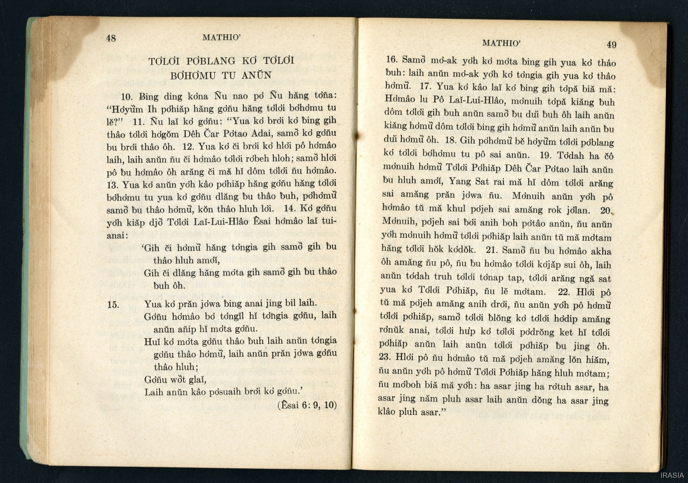 Quote this document Dournes, Jacques 1946-1955 [accessed: 2026/2/2]. "Evangiles : Tơlơi phrâo hiăm MATHIƠ" (Object Id: 174636). In Evangiles : Tơlơi phrâo hiăm MATHIƠ. ODSAS: https://www.odsas.net/object/174636.