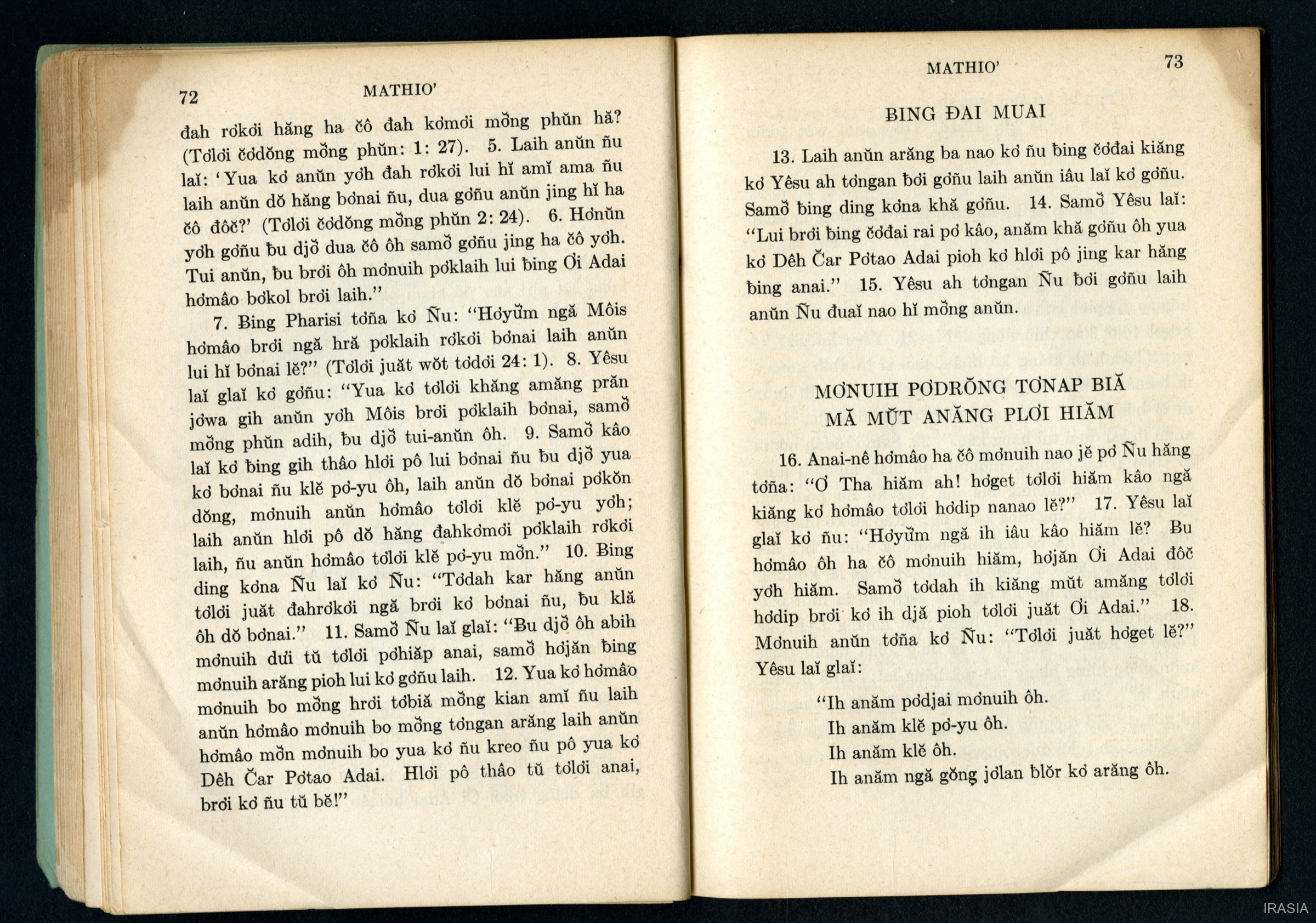 Quote this document Dournes, Jacques 1946-1955 [accessed: 2026/2/2]. "Evangiles : Tơlơi phrâo hiăm MATHIƠ" (Object Id: 174648). In Evangiles : Tơlơi phrâo hiăm MATHIƠ. ODSAS: https://www.odsas.net/object/174648.