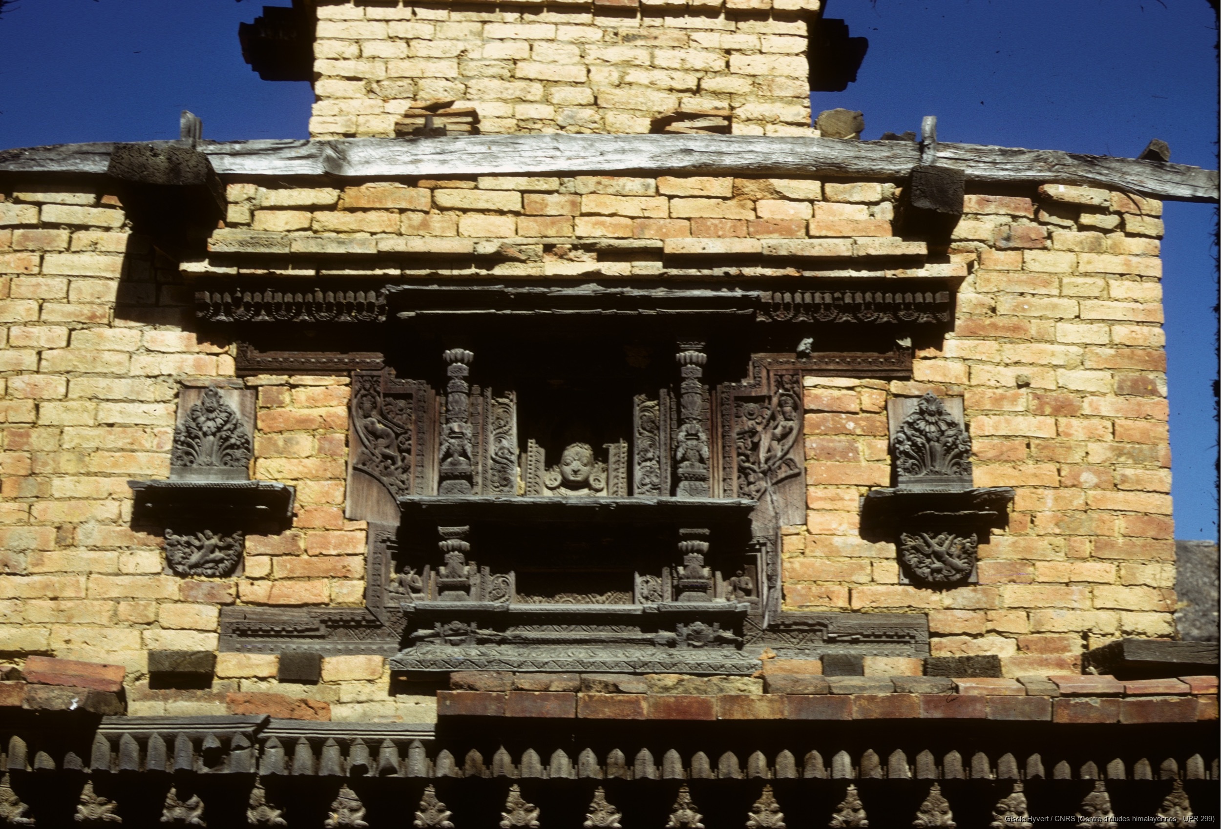 Vallée de Kathmandu c.1971 / Fenêtre en bois sculpté du temple en ruine de Visheshwar (Bisheshwor) Mahadev dans l'enceinte du temple d'Indreshwar Mahadev.  / Hyvert, Gisèle  / Panauti (Kavrepalanchok district), Népal